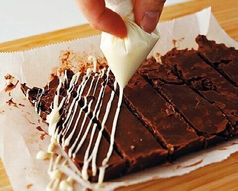 作り方(4)で切り分けてから、溶かしたホワイトチョコ*で斜めに線を描く。