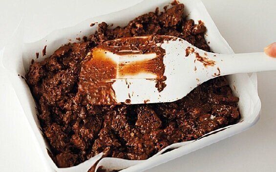 ゴムべらでくるくる混ぜてなめらかにする。チョコレートの溶け残りがあれば、10秒ずつ追加で、ラップを掛けて再加熱する。