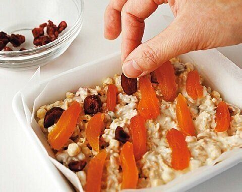 作り方(3)で、型に広げ入れたあと、アプリコットとクランベリーをのせてから、オーブン用シートをかぶせて両手でぎゅっと押さえる。