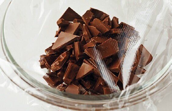 耐熱ボウル(直径15cm)にチョコレートを割って入れ、ふんわりとラップを掛けて電子レンジ(600W)で1分20秒加熱する。