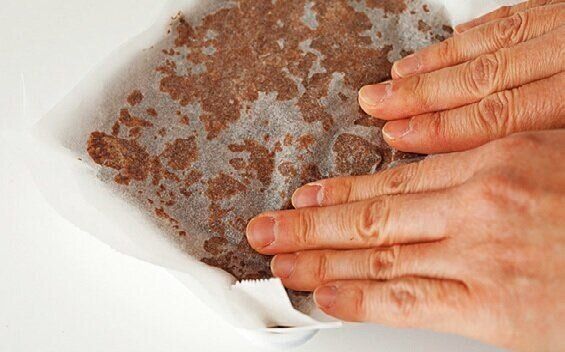 オーブン用シート(バットと同じ大きさ)をかぶせて両手でぎゅっと押さえて表面をならす。こうすると具が均等に行き渡り、切ったときに割れにくい。オーブン用シートをかぶせたまま、冷蔵室に20分以上入れて固める。