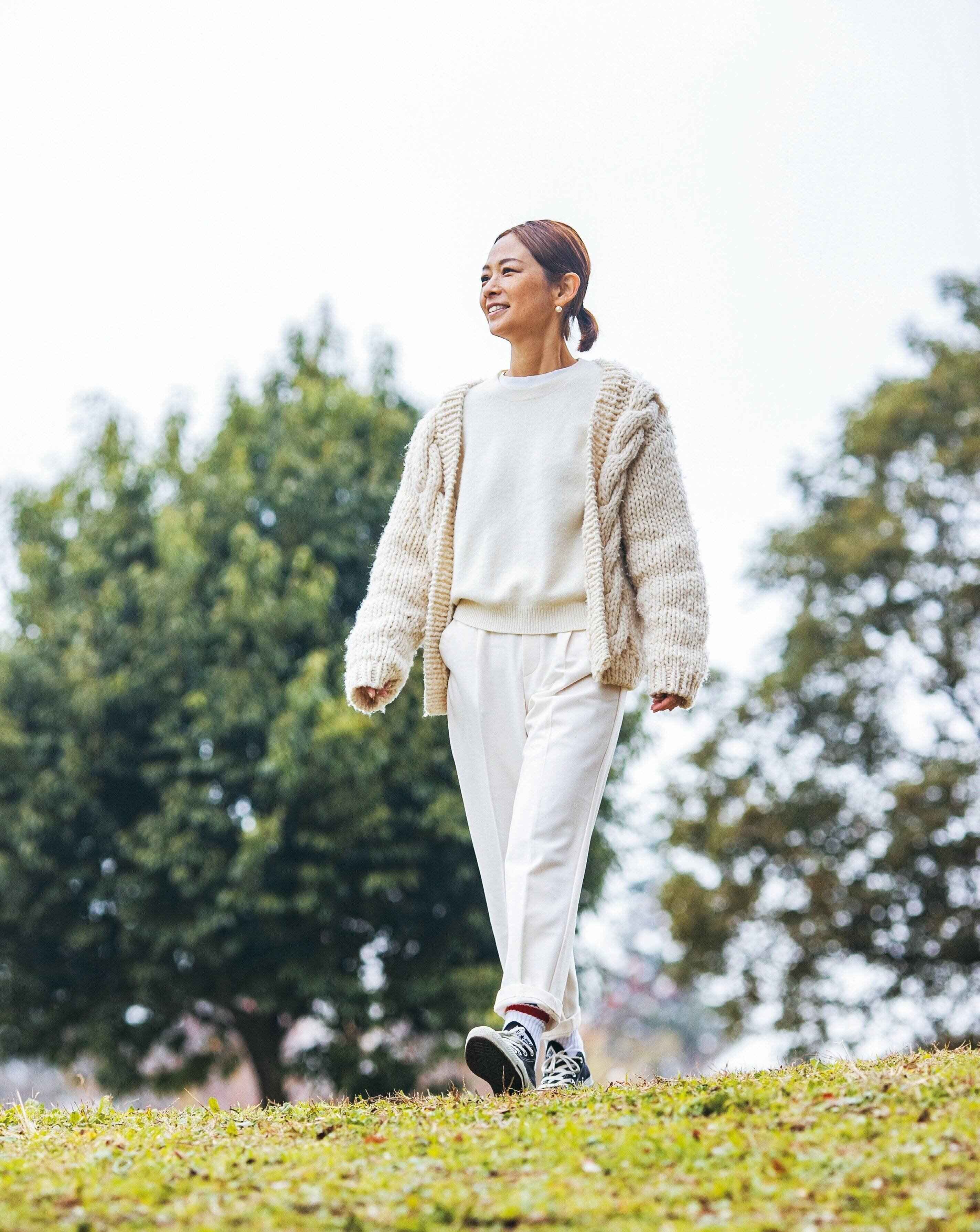 白は雰囲気が明るくなるからふだんからよく着ます。ママ友に「汚れない?」と聞かれるけど、高い服は買わないので汚れたら洗えば平気。アウターはノーブランド。セーターはユニクロ、パンツはGU。