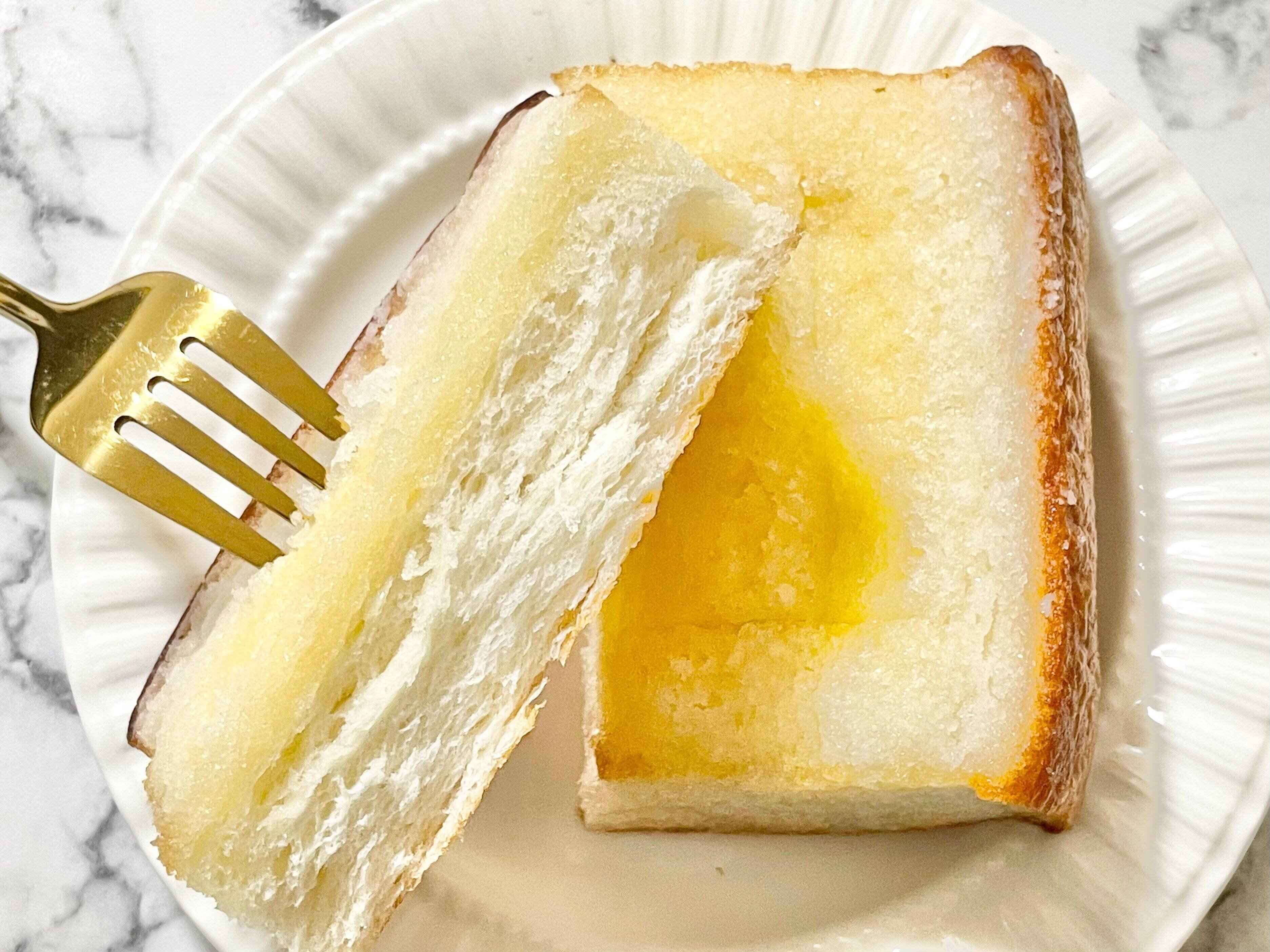 そのままだとややパサつきが気になったのと、「やっぱりトーストは温めたほうがおいしいでしょ!」ということで、600Wの電子レンジで20秒ほど温めてから食べたら……パンがしっとりもっちり。