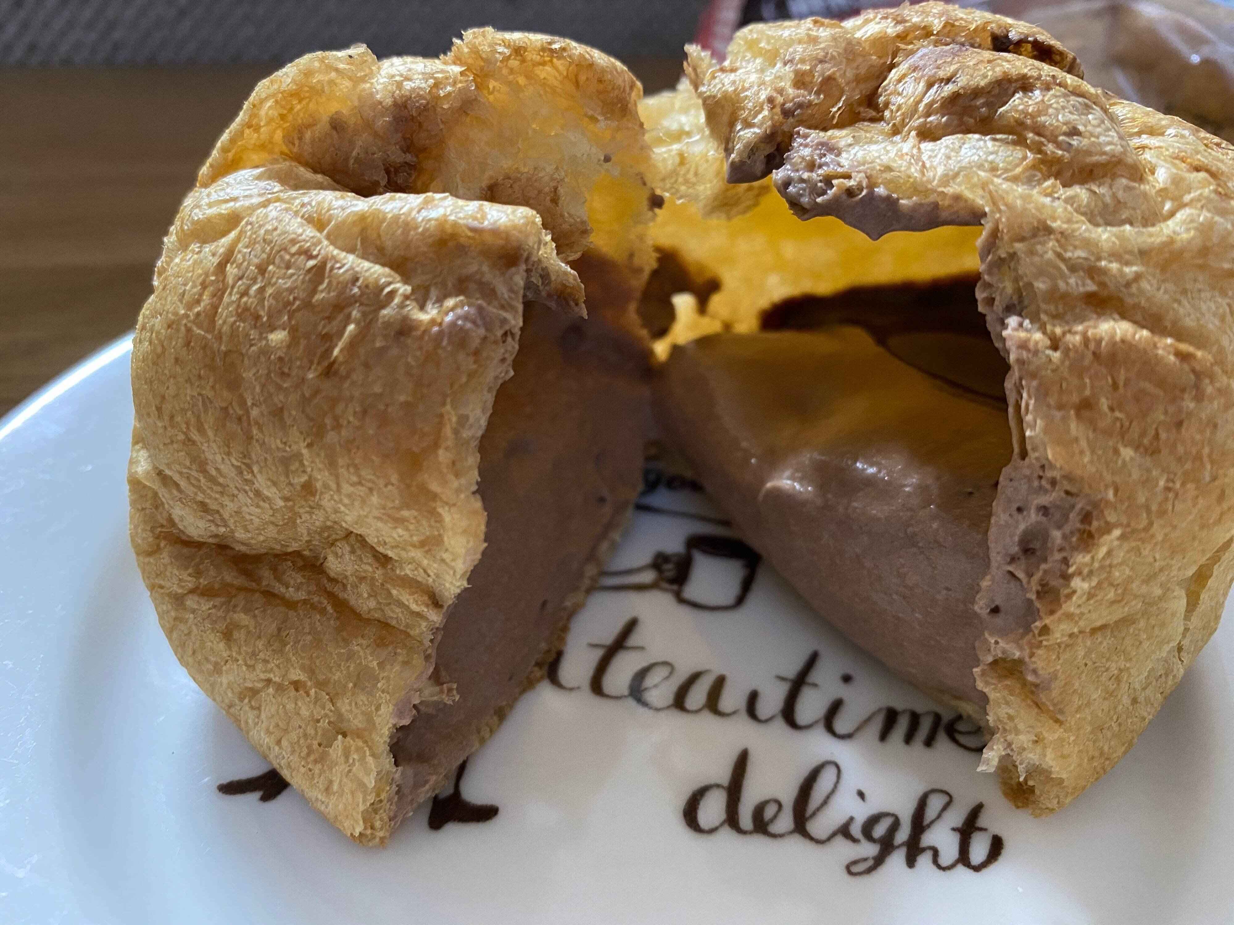 ボリュームのあるシュークリームを割ってみると中にはチョコクリームがたっぷり。
