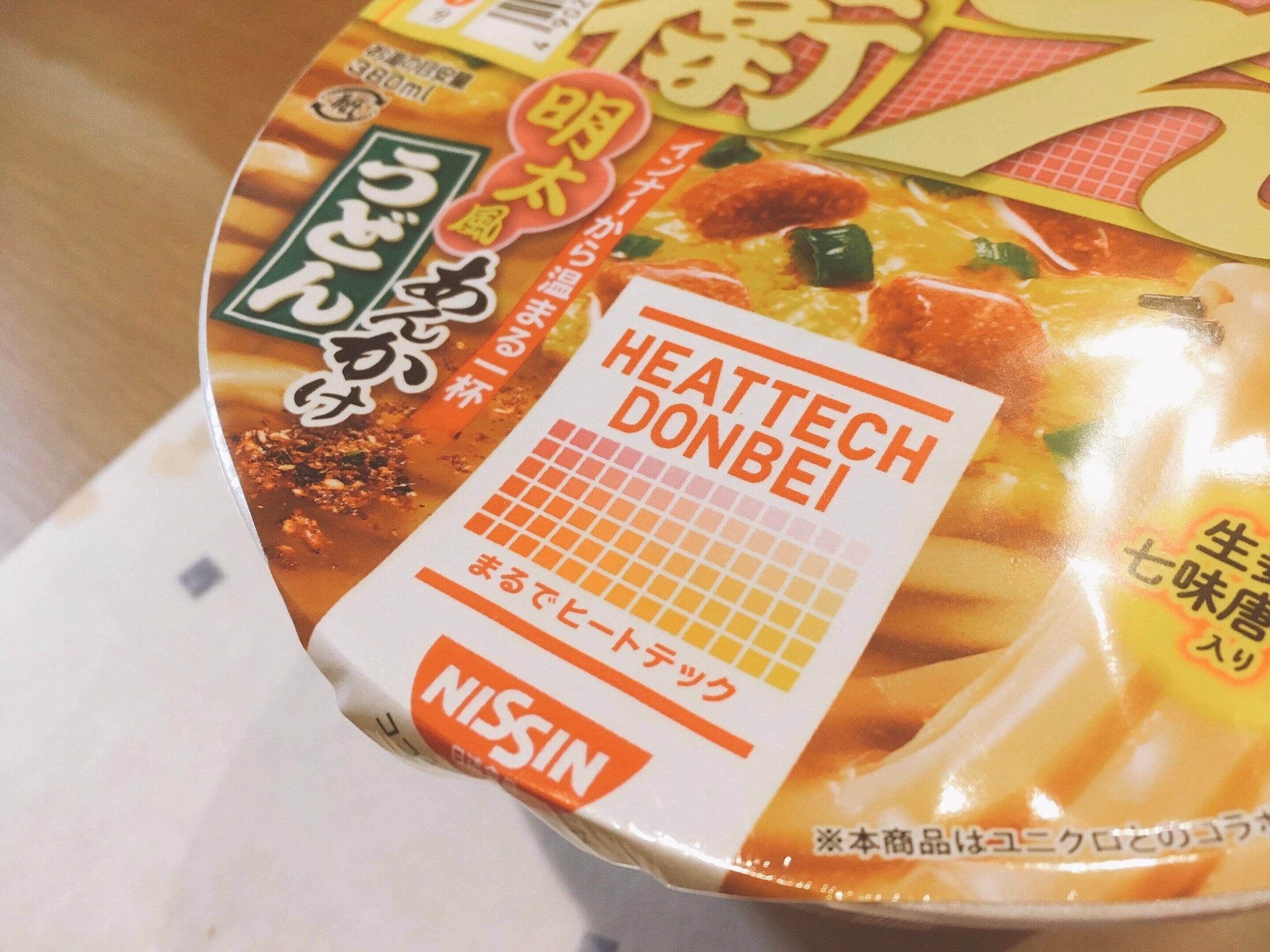 皆さんお馴染みの「どん兵衛」。そのパッケージにこれまたお馴染みのユニクロ「ヒートテック」のロゴが書かれてあります。