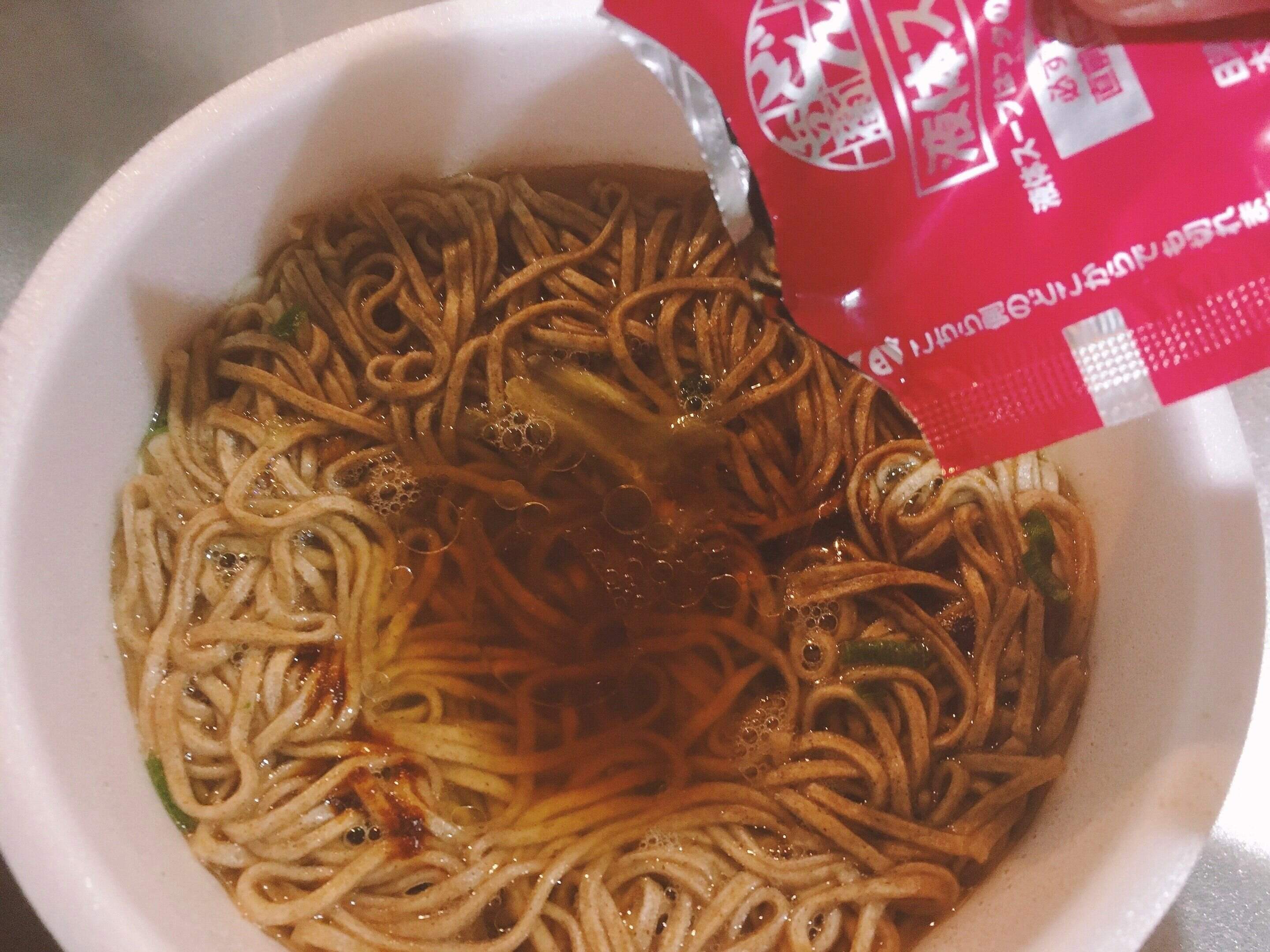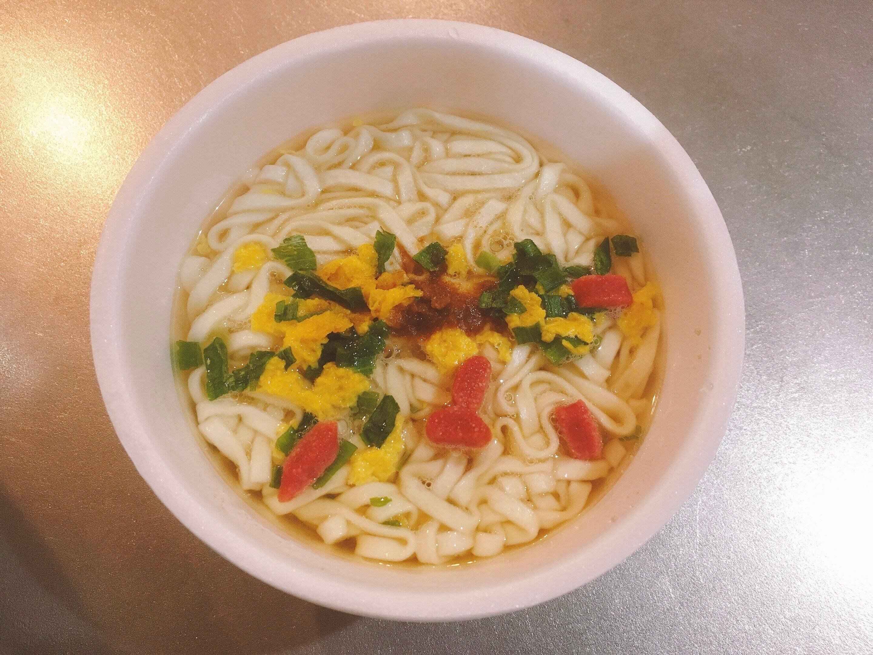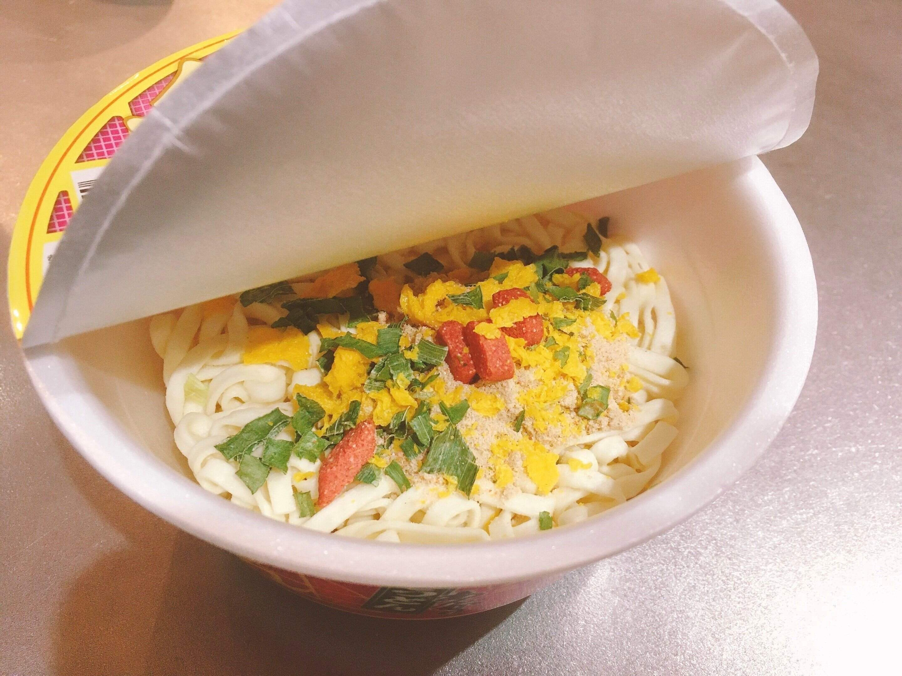 お湯を入れてから5分、完成しました!こちらも家族とシェア。七味を入れるとさらに色合いが良くなります。容量はそばよりも少し少なめ。生姜の風味が感じられるダシとかまぼこの明太子風味で、より体が温まるような気がします。ふわふわのかきたまが入ることで、全体的にやさしい味わいにまとまっています。