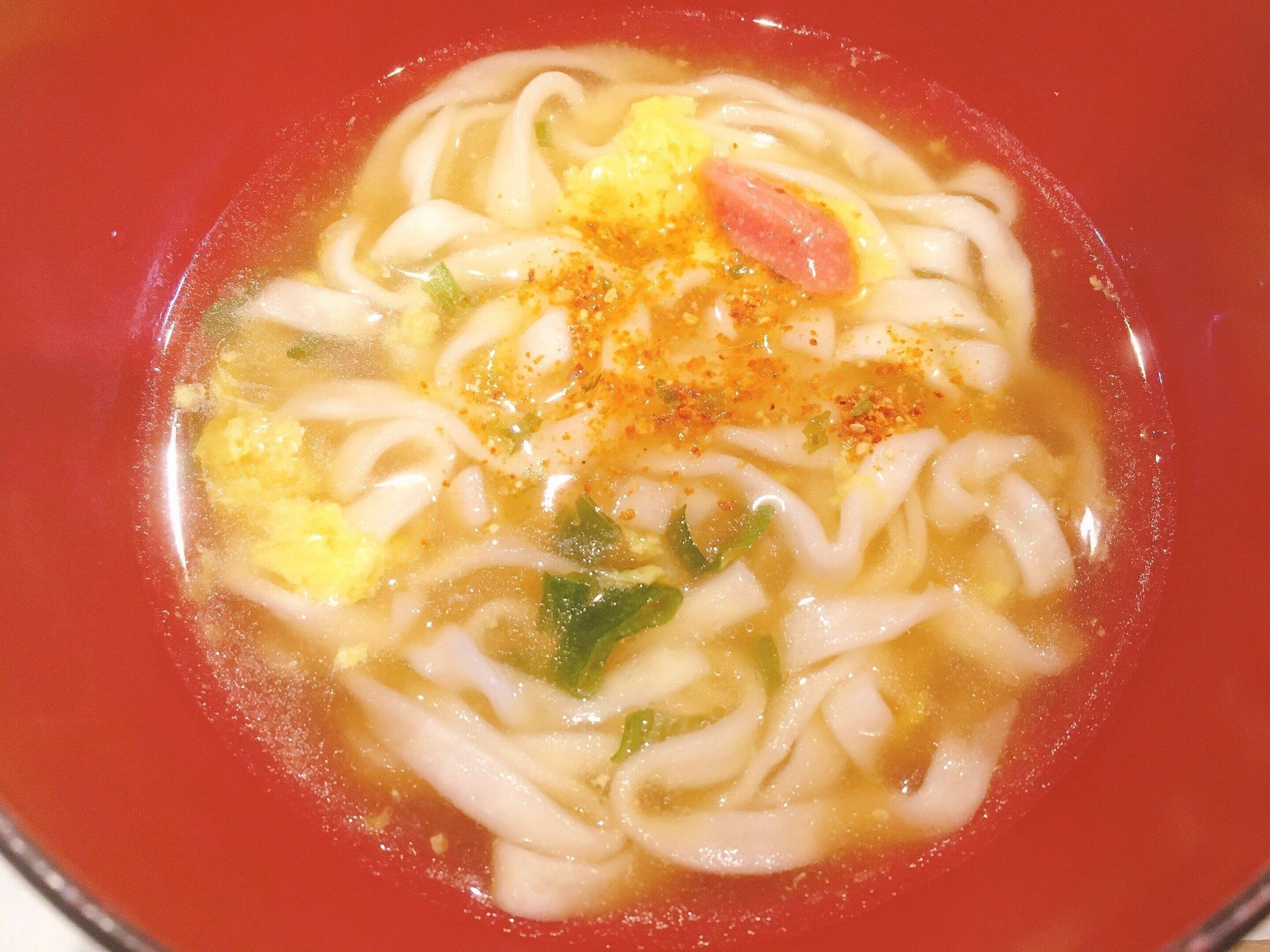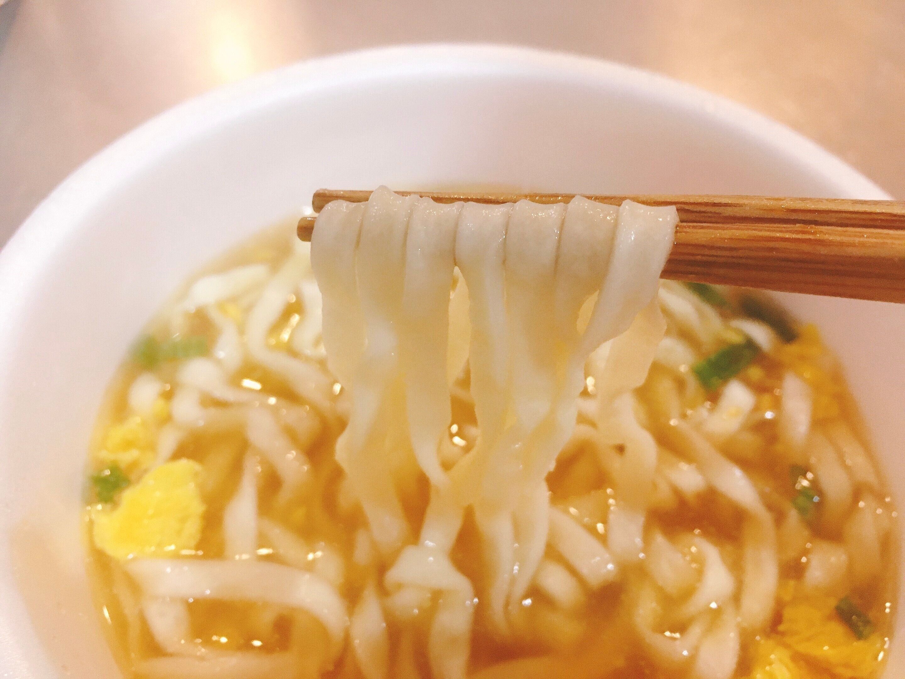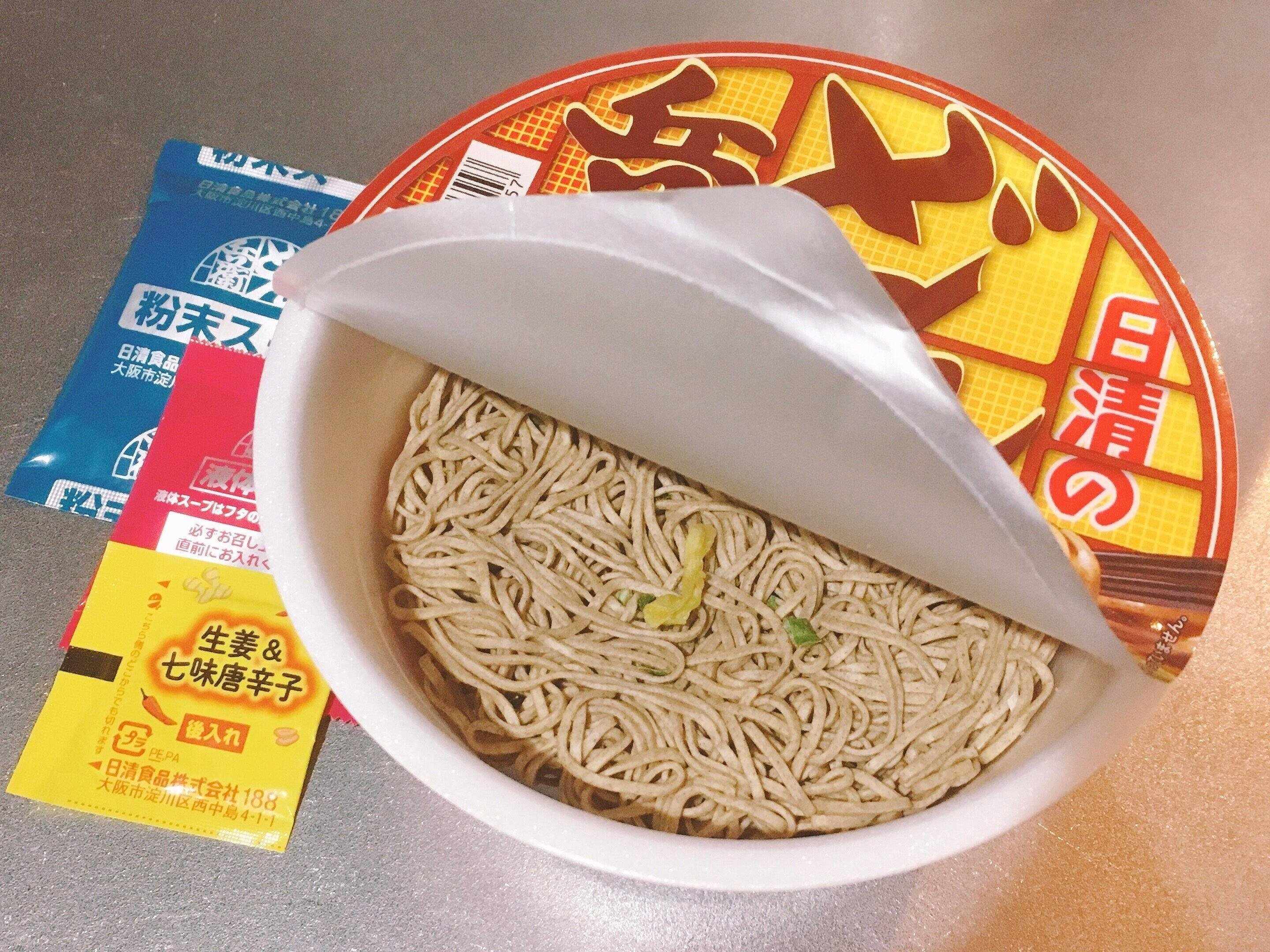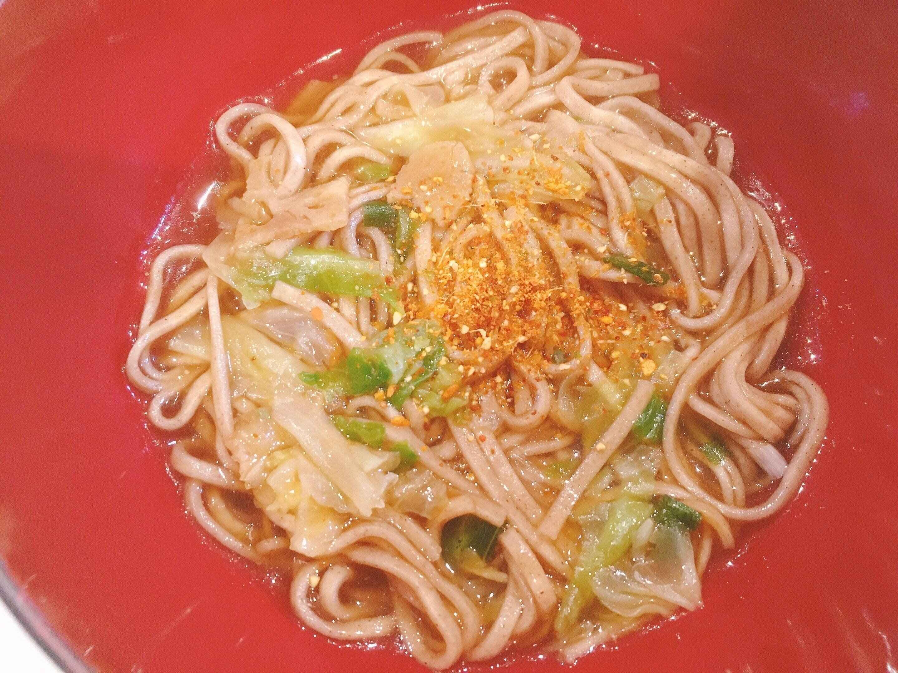 お湯を入れてから5分、完成しました!こちらも家族とシェア。七味を入れるとさらに色合いが良くなります。容量はそばよりも少し少なめ。生姜の風味が感じられるダシとかまぼこの明太子風味で、より体が温まるような気がします。ふわふわのかきたまが入ることで、全体的にやさしい味わいにまとまっています。