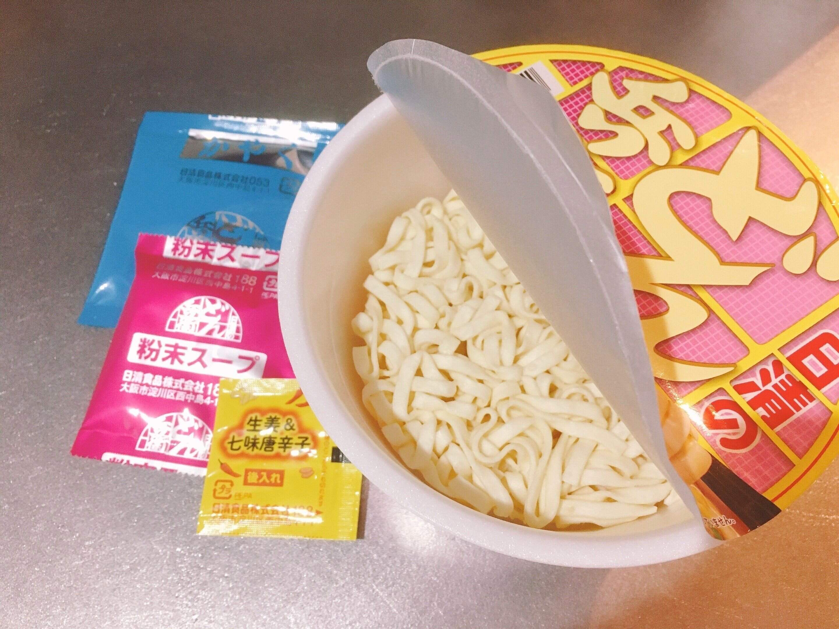 お次は明太風あんかけうどんを。こちらに入っていたのは液体ではなく、かやくと粉末スープ、生姜&七味唐辛子の3つ。