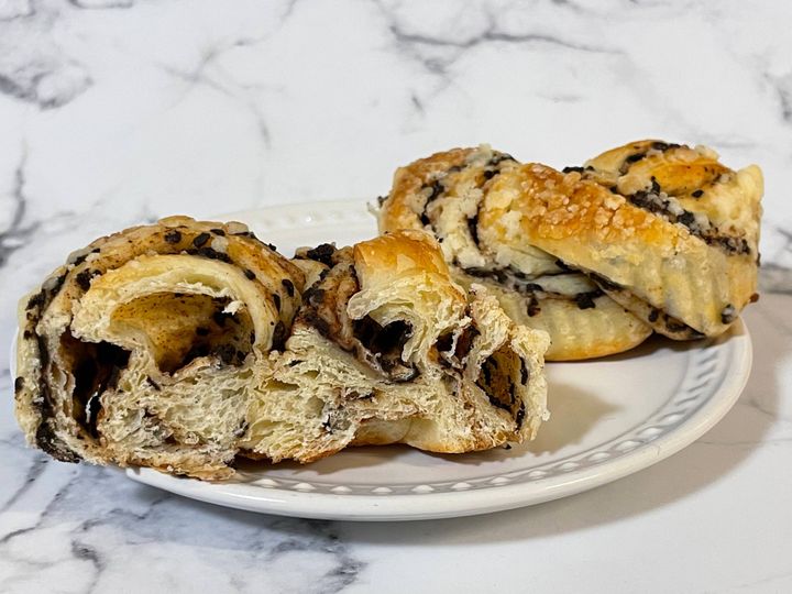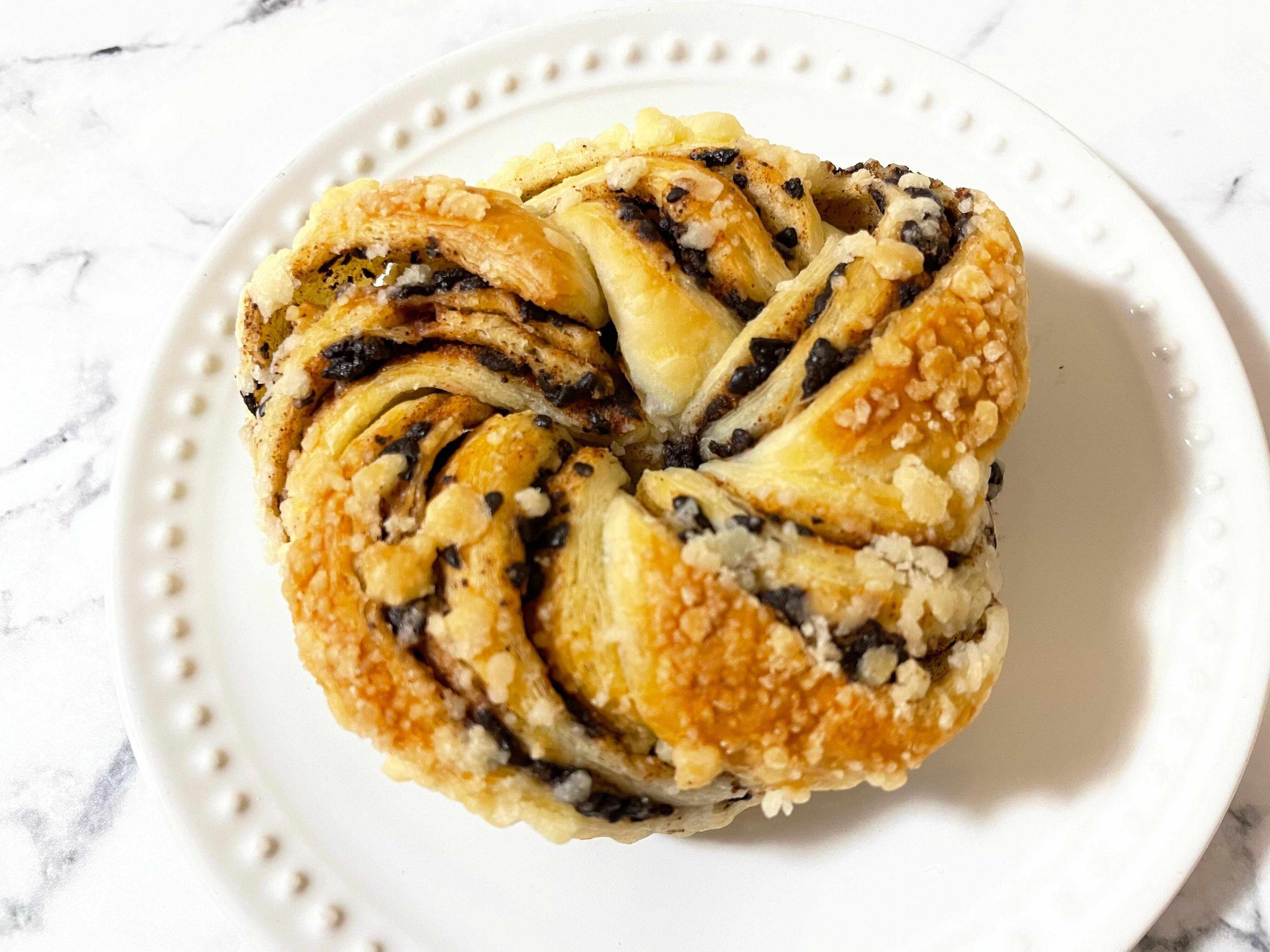 たまごをたっぷり使用したバター入りのデニッシュ生地に、ベルギー産チョコとシナモンクリームを折り込み、クランブルがトッピングされているそう。