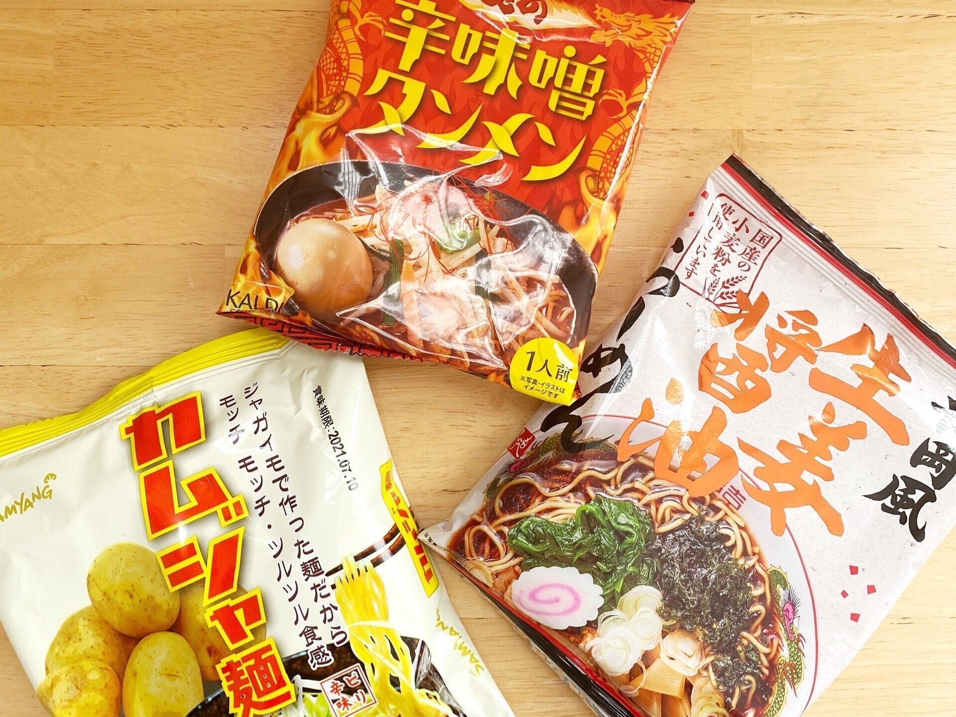 左から、カムジャ麺(108円)、ジャガイモでつくられた麺はとにかくモチモチ。スープはコクがありほどよくピリ辛で一度食べたらハマる人続出!私もリピーターの1人です。