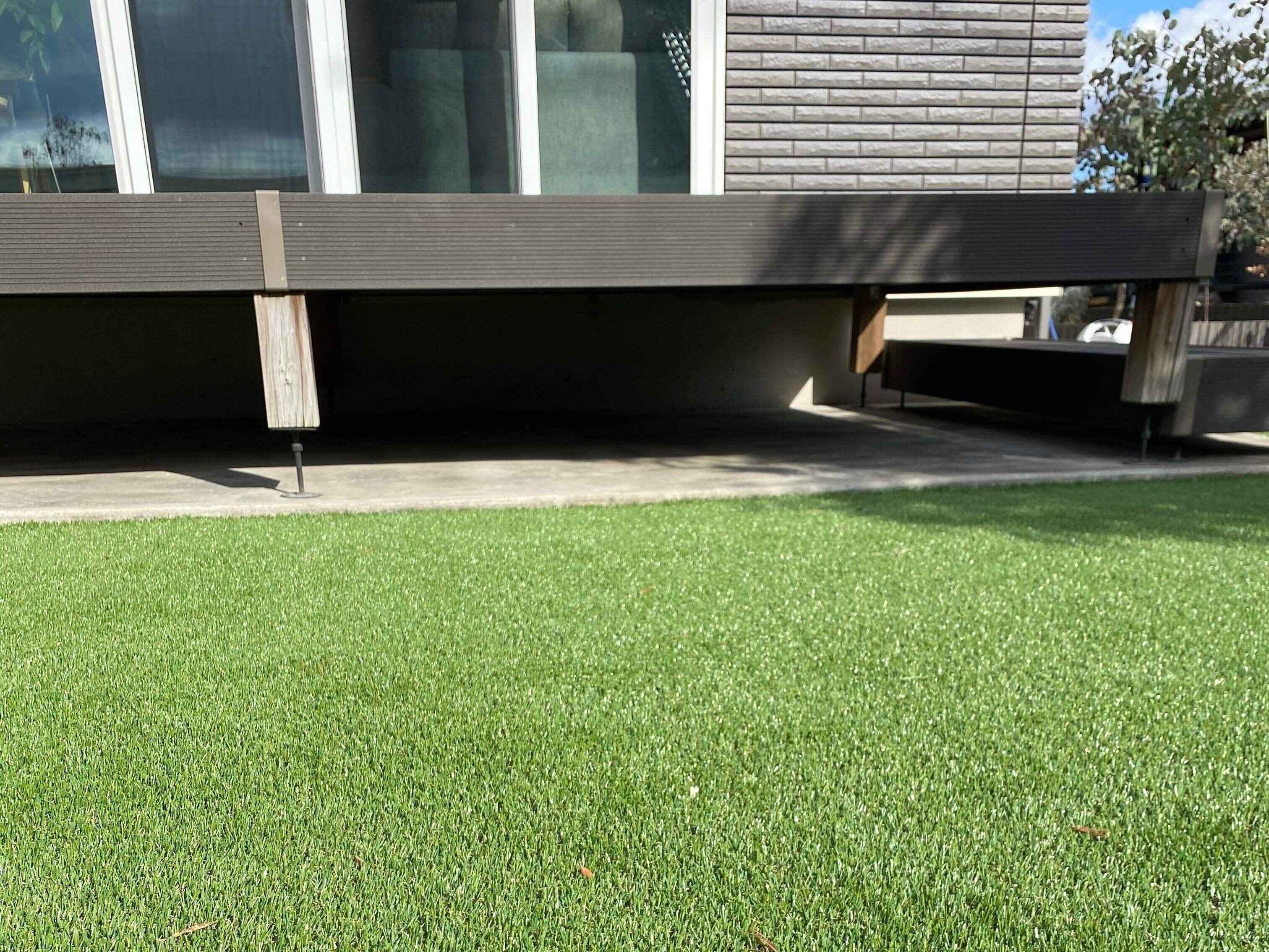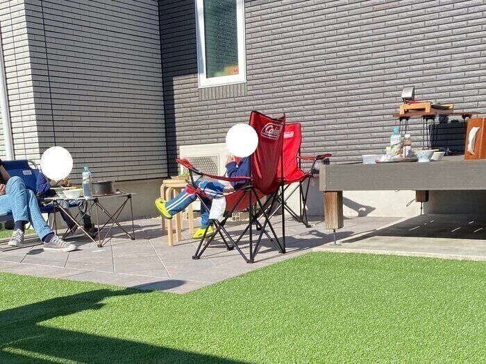 手入れが簡単な人工芝に張り替えて、庭でテーブルやイスが置きやすいように
