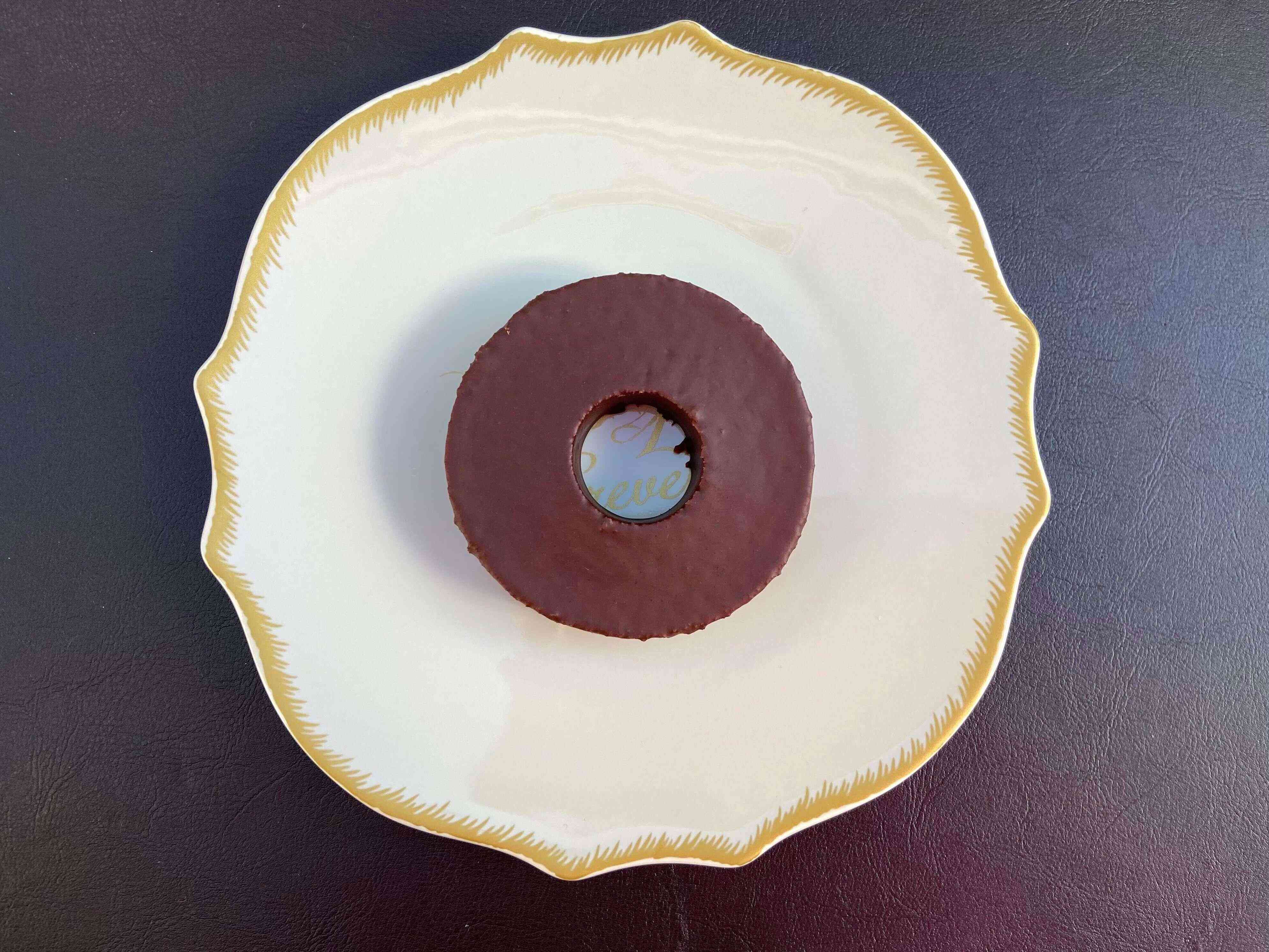 プラスチックのお皿で守られています。(チョコがけバウムクーヘンも同様に、プラスチックのお皿で守られていました。)