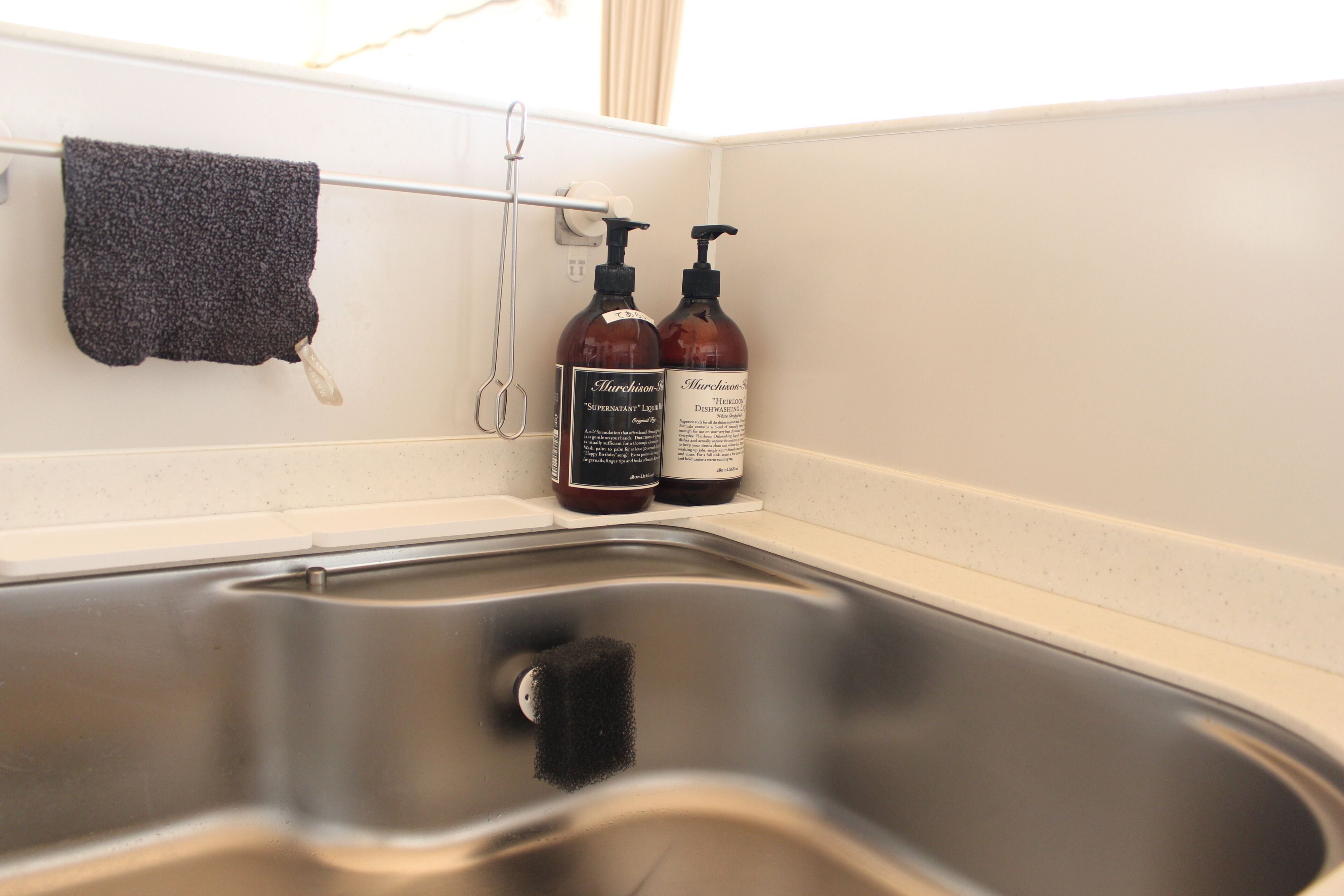 最初は、キッチンのシンクに元々付いてあったよくあるステンレスのラックのようなものに、洗剤と併せて置いていました。