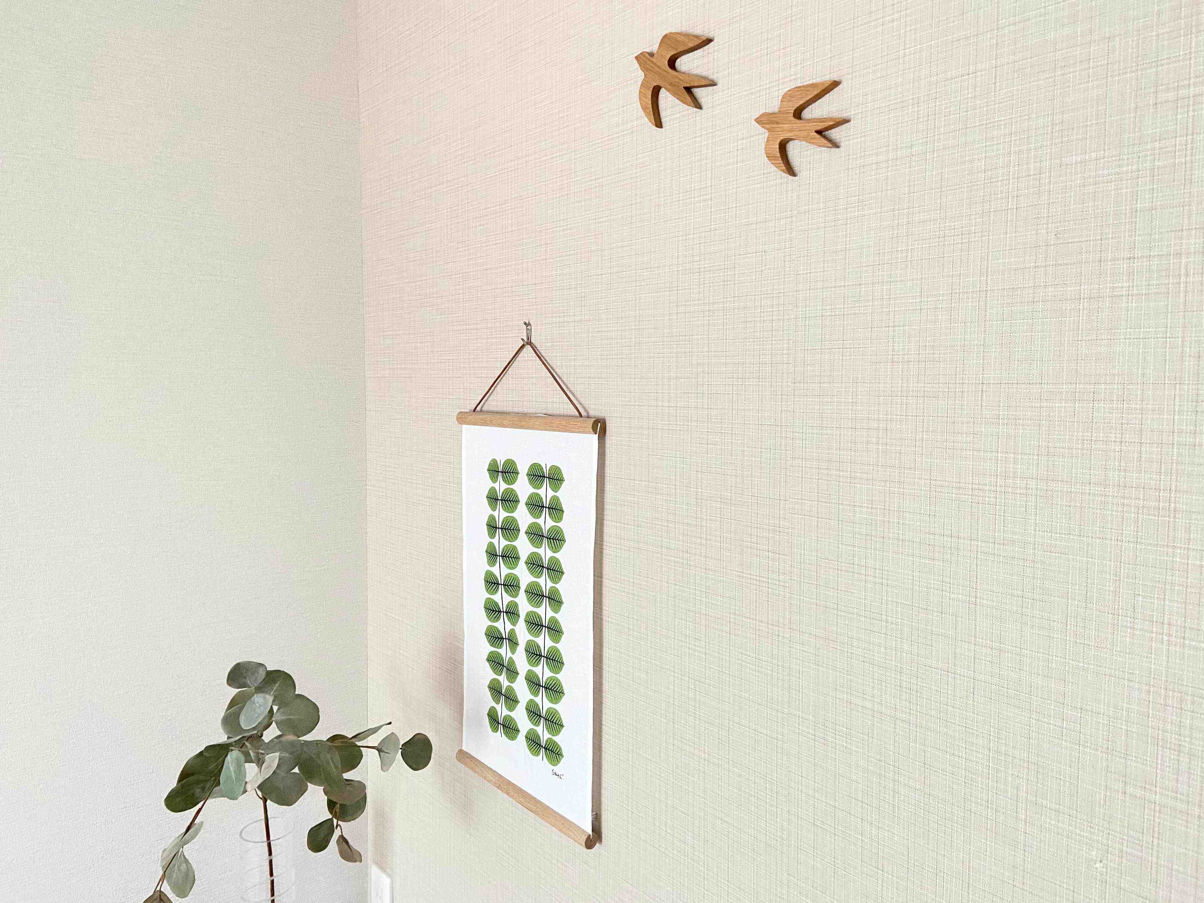 仲良く飛ぶつばめのオーナメントのM・Sサイズ。木の質感がありプチプラだけど雰囲気を上げてくれるインテリア雑貨です。紐付きタイプと紐なしタイプ、タモ材とウォルナット材がありますが、写真とレビューを参考に我が家に合いそうなタモ材・紐なしタイプをチョイスしました。
