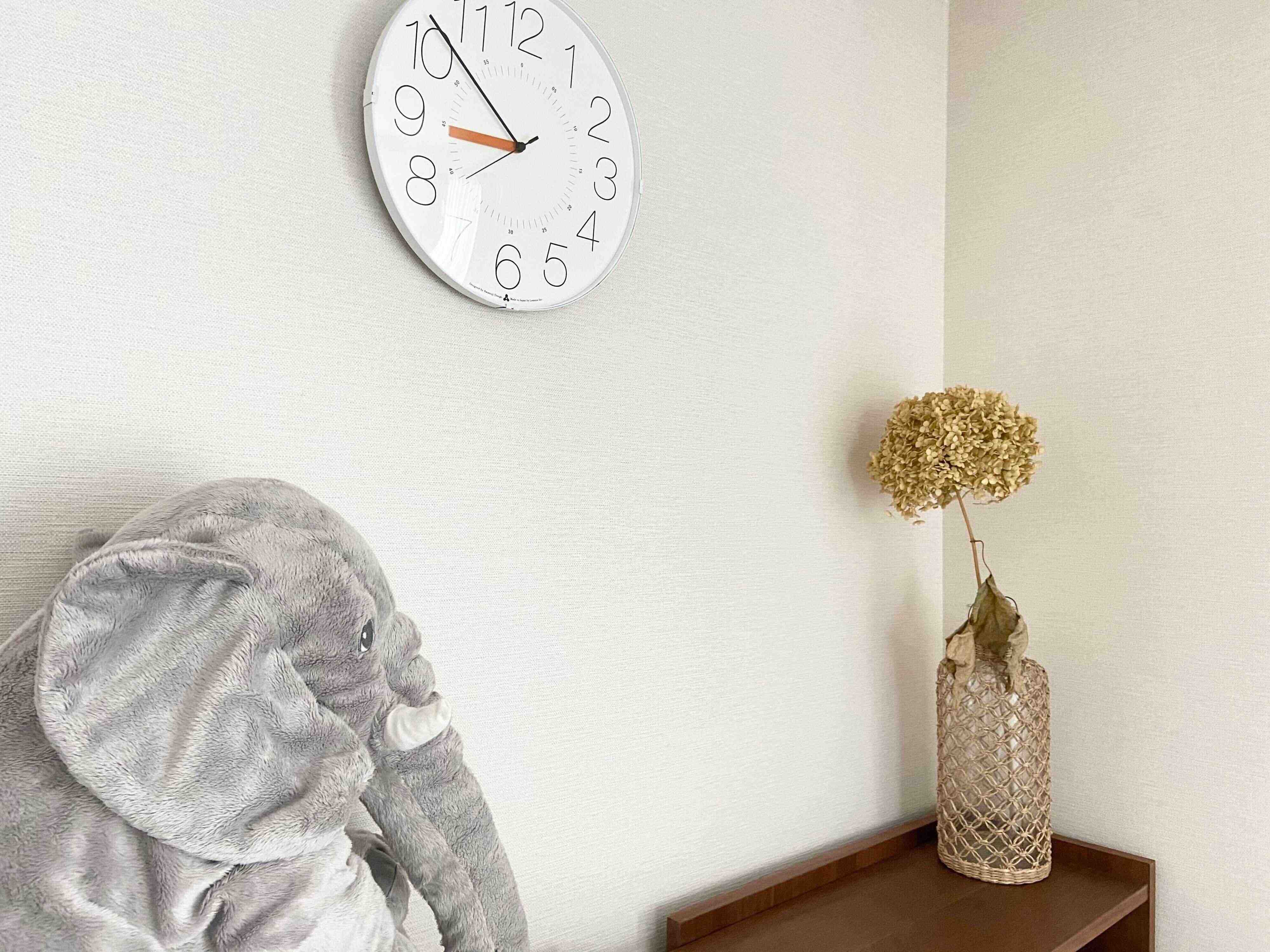 とっても大きな文字盤で見やすくて、短い針がオレンジ色でアクセントになっているお気に入りのレムノスの掛け時計。見た目もシンプルで素敵ですが、電波時計なので時計を合わせ直すという手間がないのもお気に入りのポイントです。