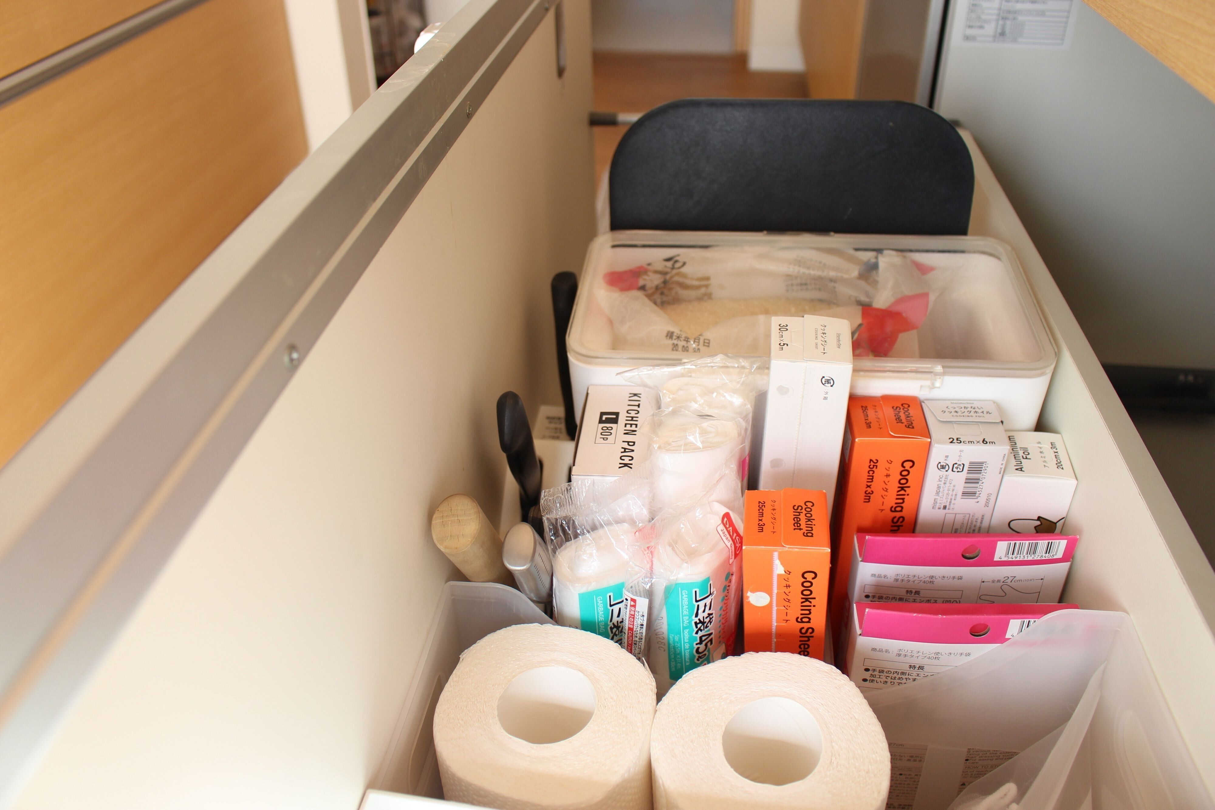 ゴミ袋など、キッチンまわりで使うものはシンク下の引き出しに収納しています。