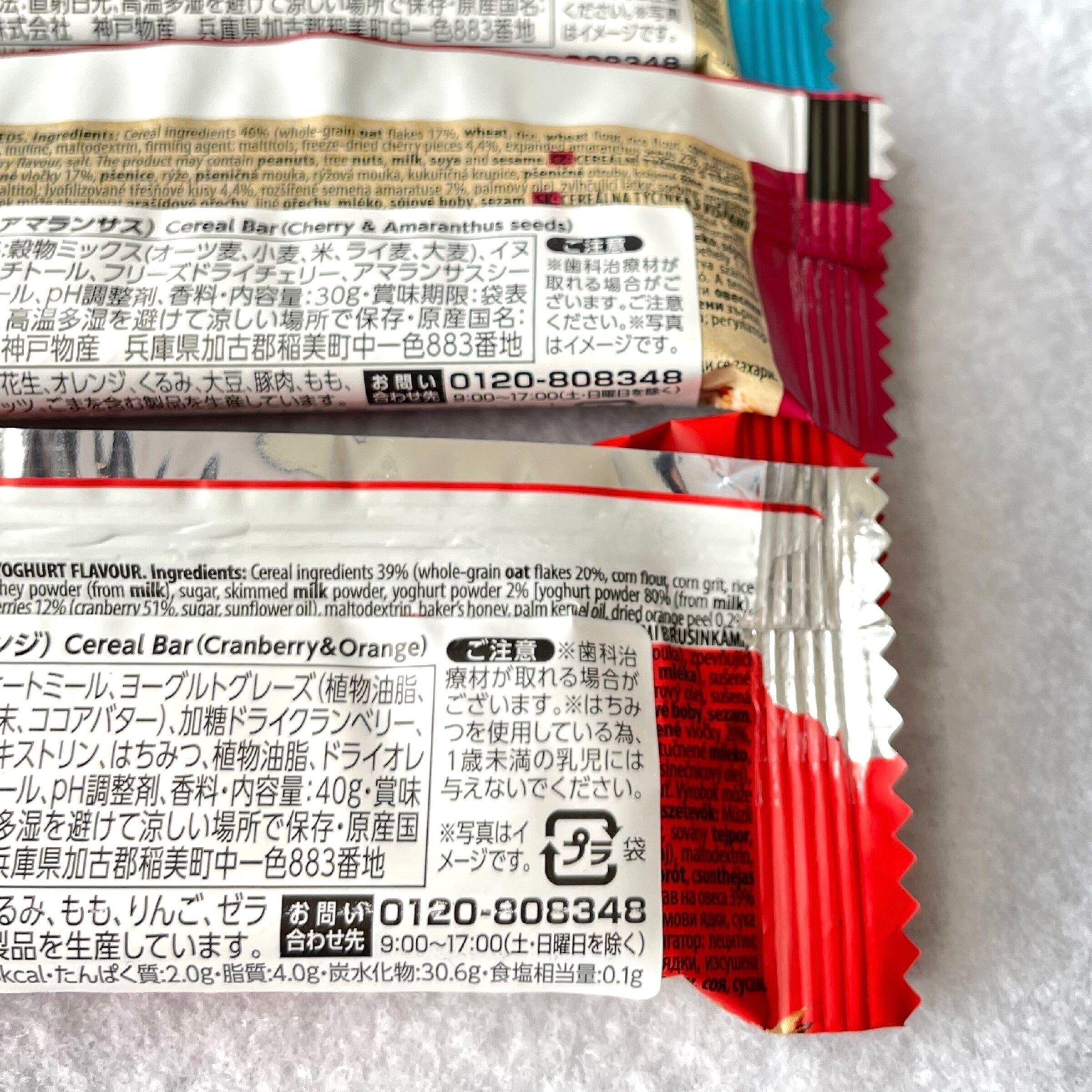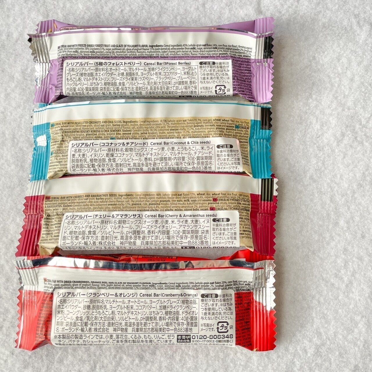 4種とも中身がギュッと詰まったねっとり感のあるシリアルバーは甘い物が好きなかたにオススメですが、ヌガーのような粘りがあるので、歯に詰め物があったり治療中のかたは気をつけてください。