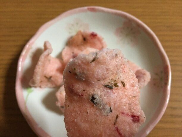 開封してみると思ったより濃い目で綺麗なピンク色のお煎餅が!ひとくちサイズで食べやすいのも嬉しいですね。