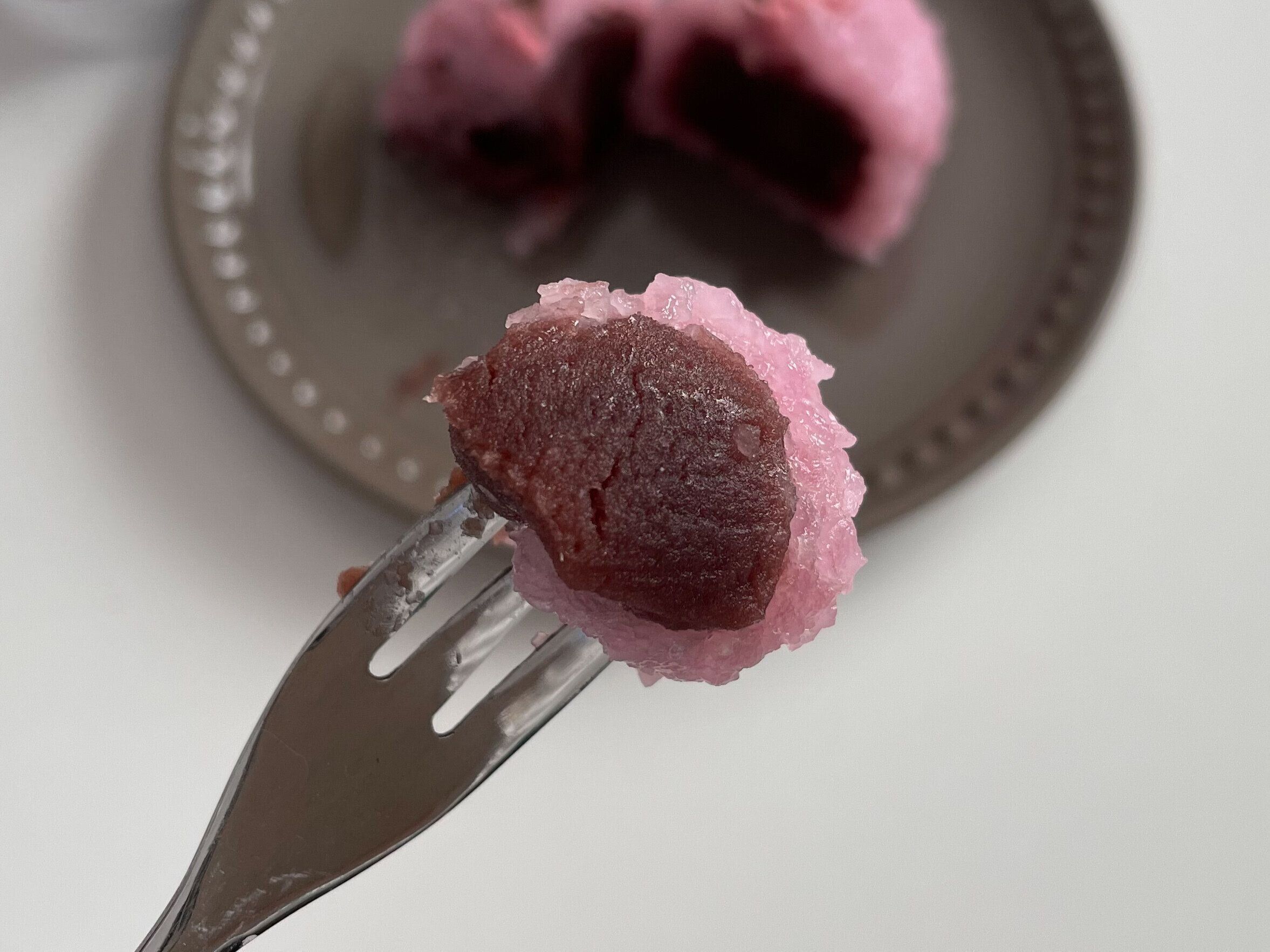 一口サイズにカットして、さっそくいただいてみました。もちもちっとした食感のもち米と、ほのかな桜の風味が口に広がります。