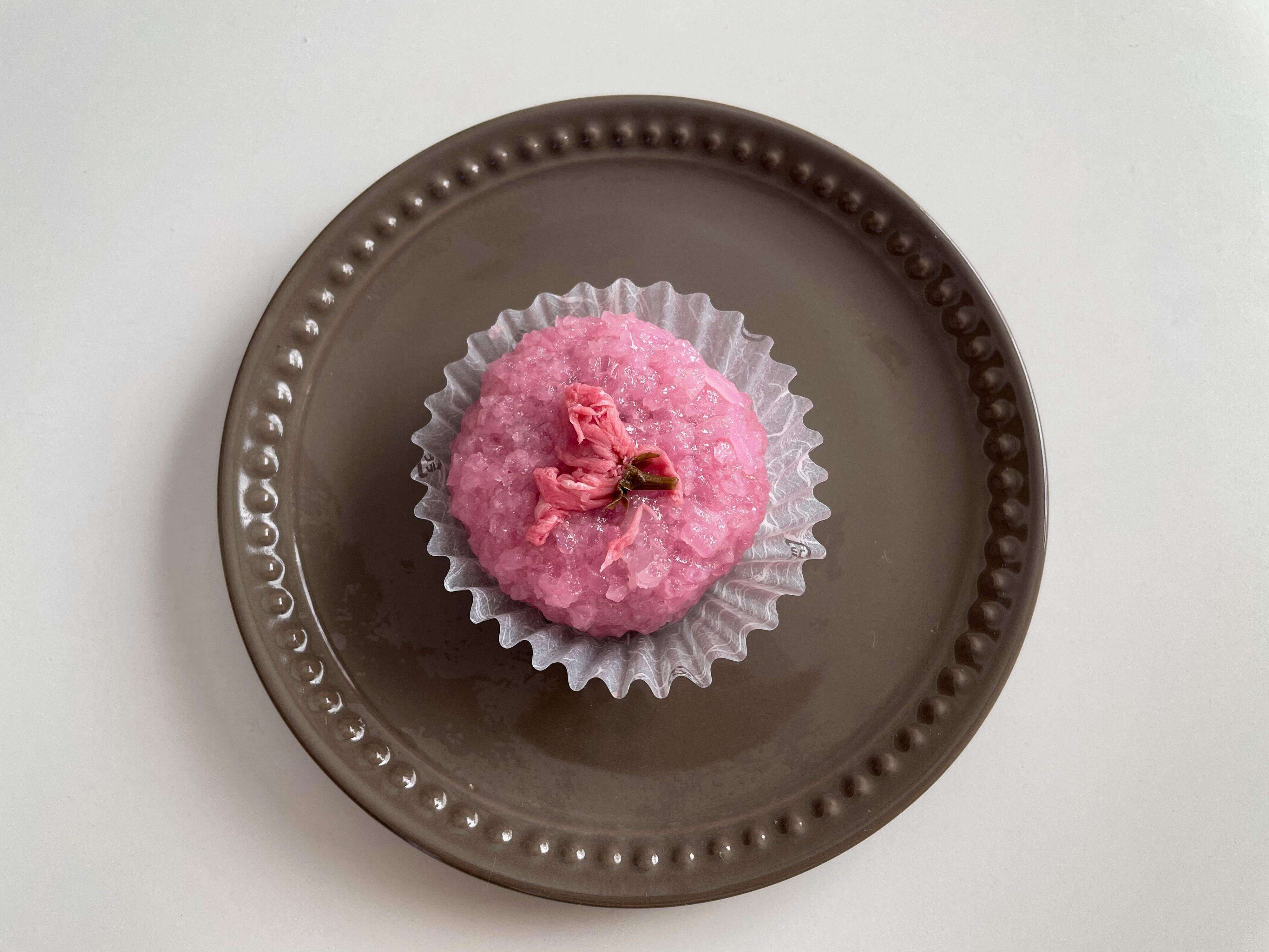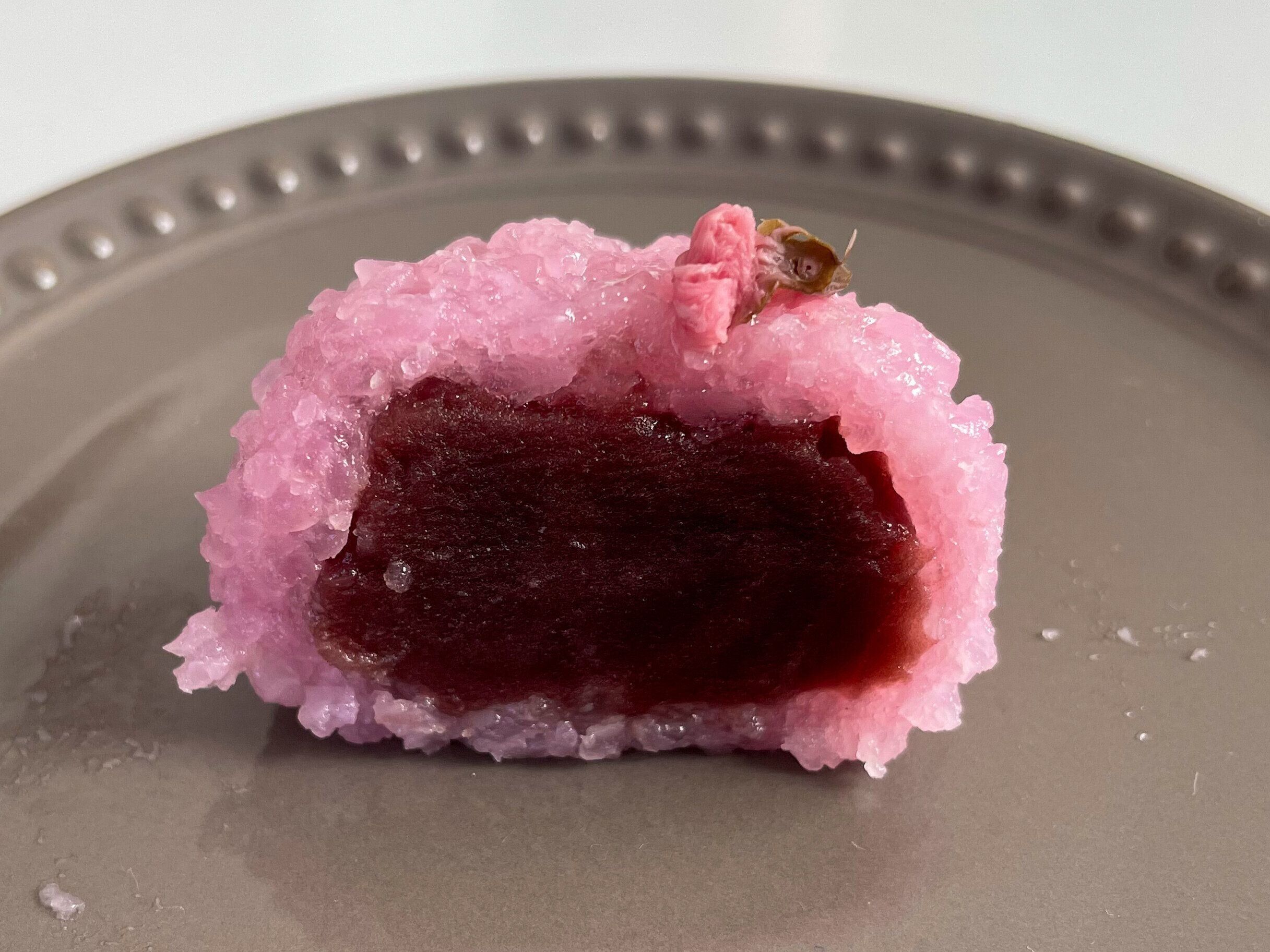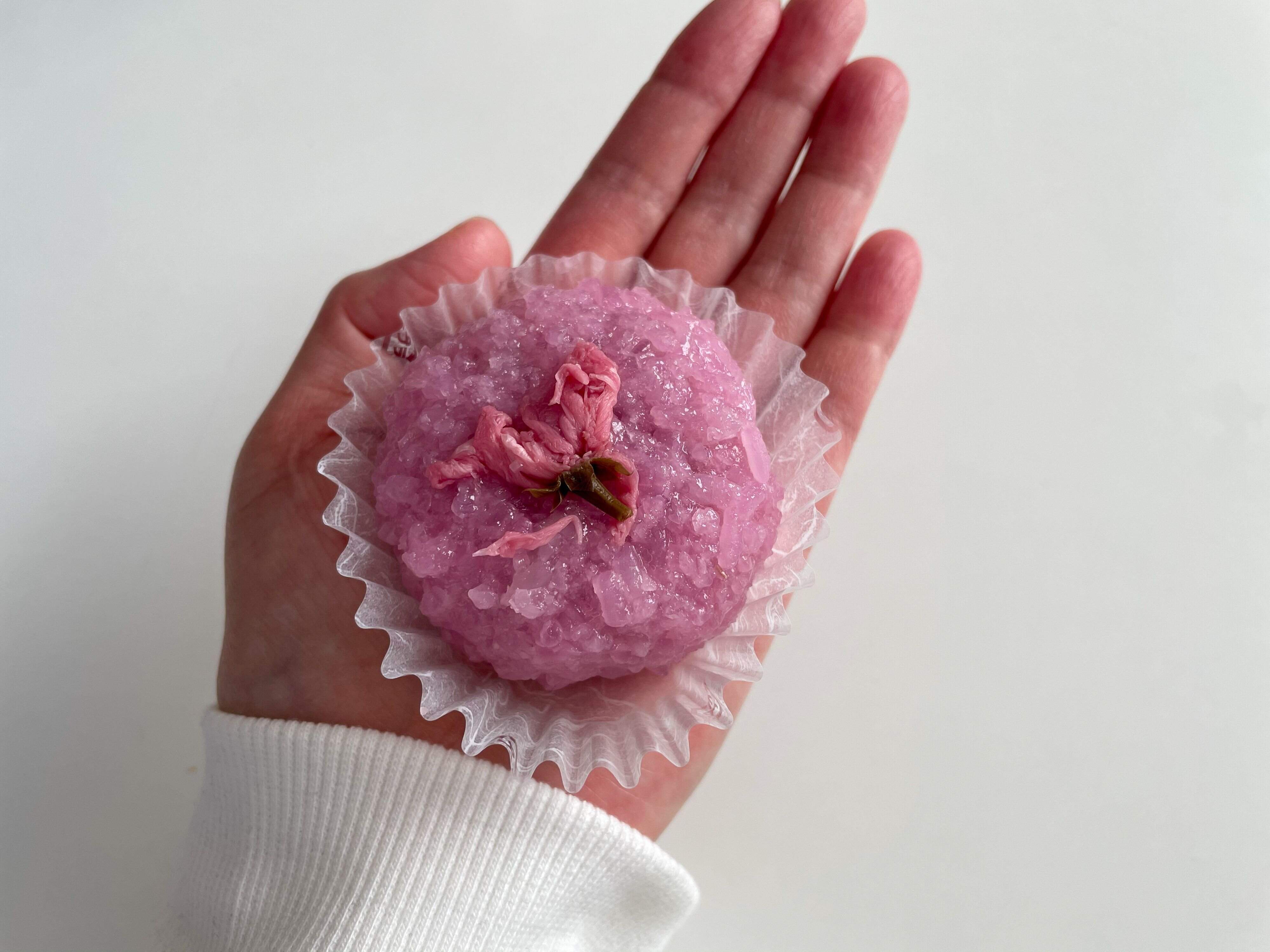 手のひらサイズの大きさで、真ん中にのっている塩漬け桜の花は、花弁と茎をしっかり確認することができました。