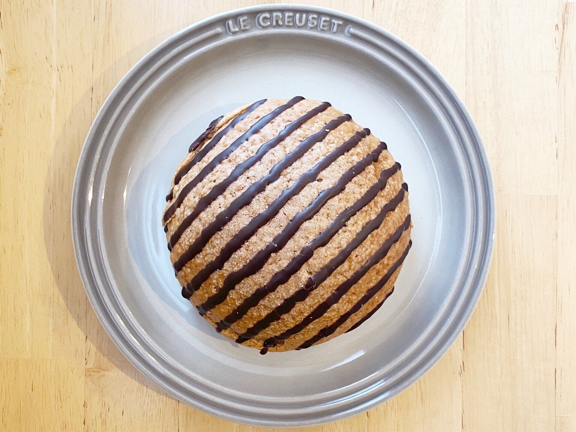 なんともオシャレなビジュアルのメロンパン。袋からだすとカカオのビターな香りがふわっとひろがります。