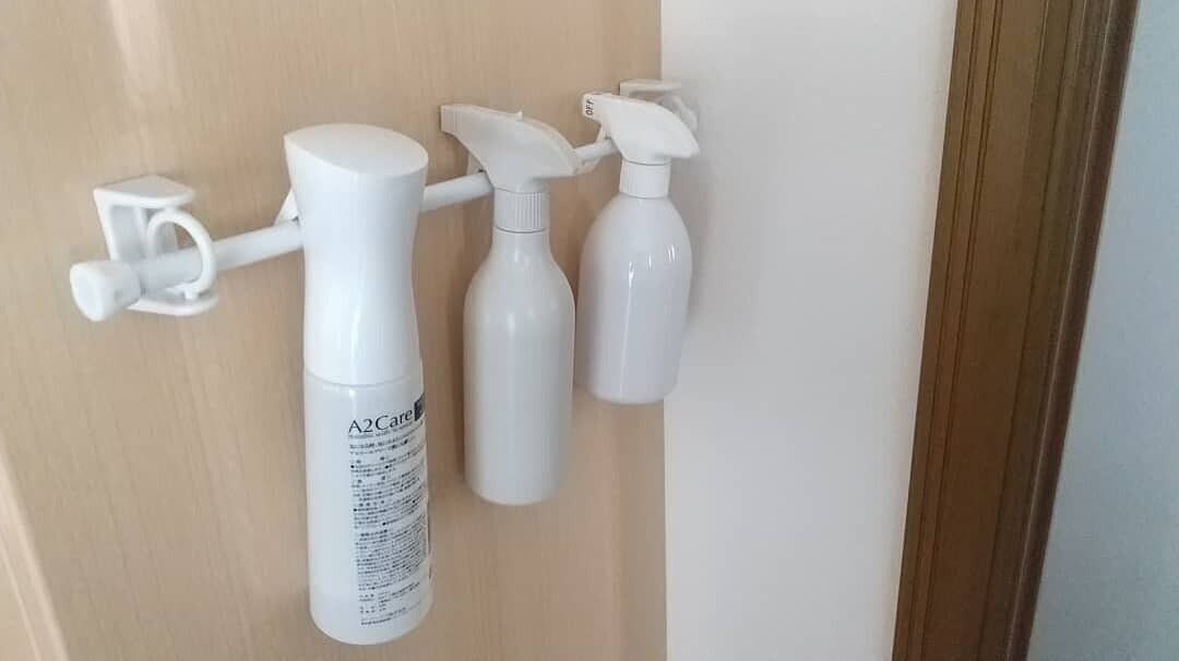 その他には、このようにスプレーボトルをまとめて引っかけ収納するのも便利です。