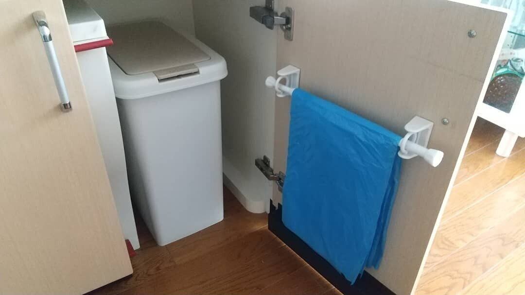 キッチンの棚の扉裏に設置して、このようにゴミ袋をかける収納にしてみました。