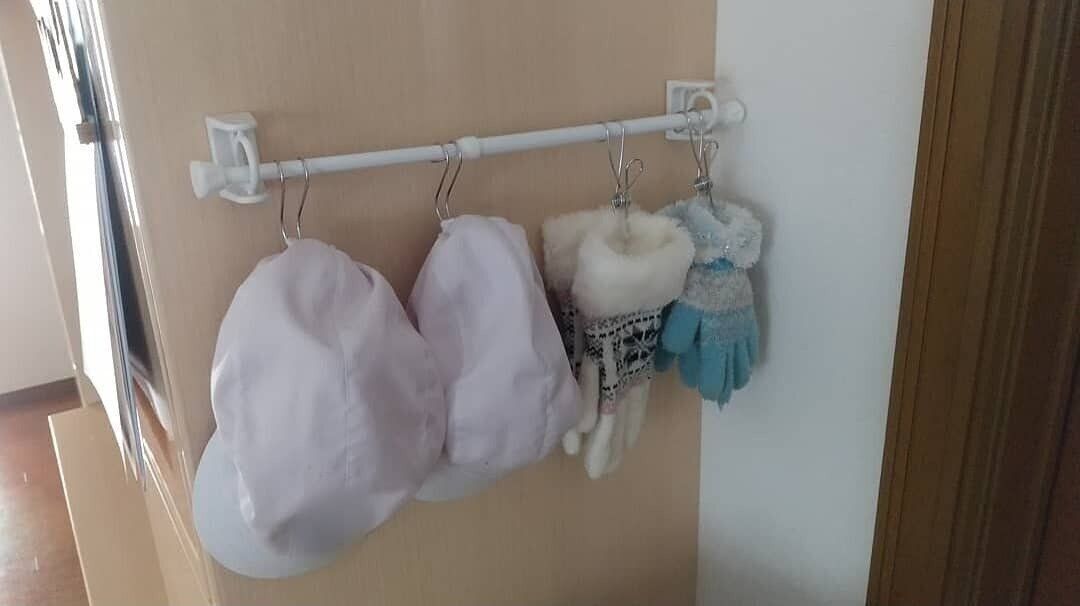 わが家ではつっぱり棒にフックをプラスして、子どもたちの通学帽と手袋を空中収納するのに活用しています。