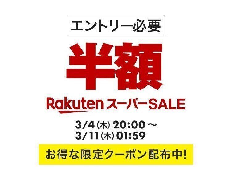半額以下アイテムが約200万点用意され、ポイント最大44倍のチャンスもある「楽天スーパーセール」が2021年3月4日(木)20時~3月11日(木)1:59まで開催中です。
