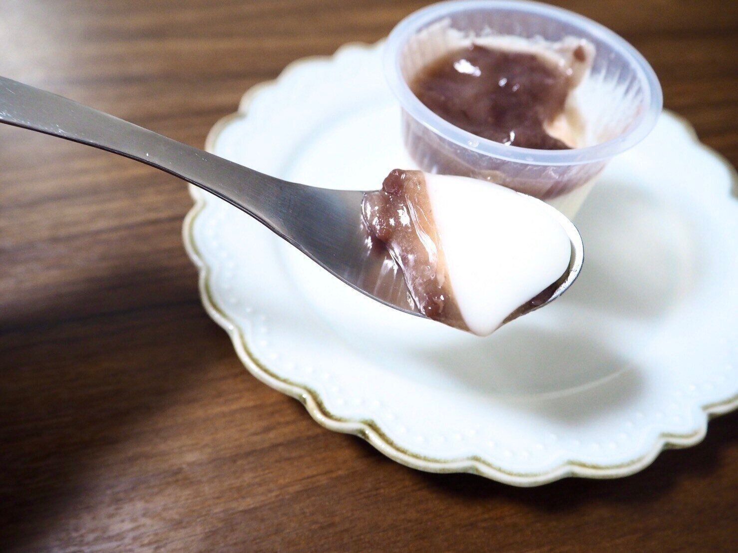 スプーンで持ち上げてみると、上の粒あんソースはとろとろ、したのミルクプリンは結構かたさを感じられます。