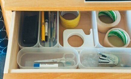 引き出しにはダイソーの収納ケースを重ねて入れ、上段にはよく使う文房具、下段には上段の予備を収納。1ケースに1アイテムしか入れないから出し入れしやすい。手前にはいちばんよく使う物を。