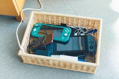 電気コンセントの近くに大きめのカゴを置き、充電コードもカゴ内に収納。カゴ=ゲームの充電ステーションだから、「片づけなさい!」と言わなくても子どもたちは自然とここに戻すように。