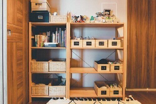 夫の在宅勤務により子ども部屋が夫の仕事スペースに。結果、ランドセルの床置きが常態化……そこで戻す場所と遊ぶ場所を近づけるべく、おもちゃの収納棚の一部をランドセル置き場に!