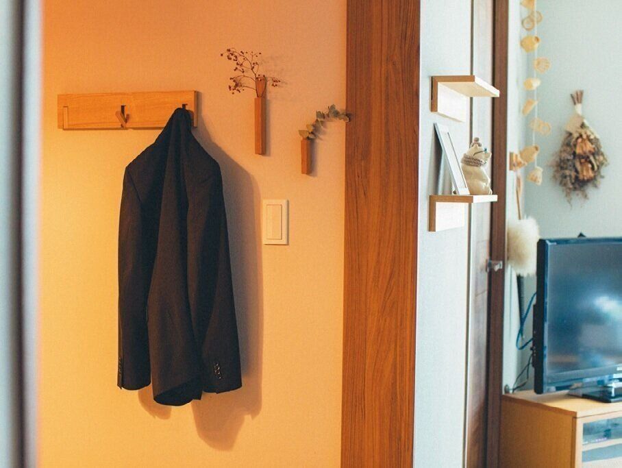 夫がいすの背もたれにジャケットを掛けるのは、掛けやすいから。そこで夫の動線を観察し、ザ!通り道であるリビング横の壁面にハンガーをスタンバイ。これで「いすにちょい掛け」問題解決!