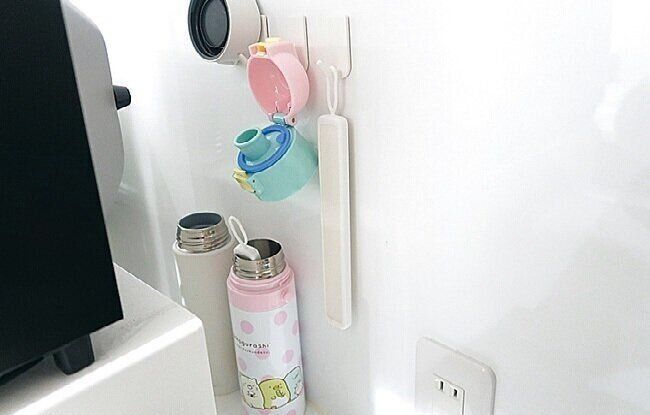 中が乾くまで水筒を出しっ放しにすると邪魔!そこでブレッドケース裏と壁のすき間を収納として活用。ふたは壁にフックをつけて引っ掛け、本体は乾燥スティックを入れて立てておけばOK。死角を使えば出しっぱなしでも気になりません。