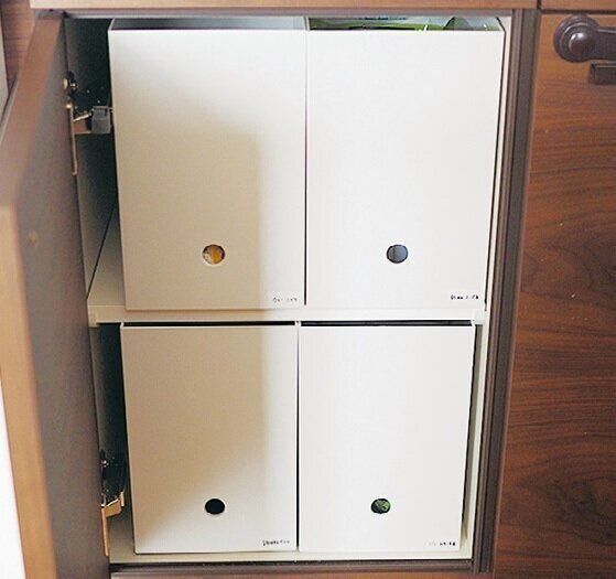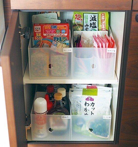 扉を開けると全面真っ白な収納。実は中身がわかりにくい(汗)。高さの低い半透明のケースにすると、中身がひと目でわかるように。在庫管理もしやすく、家族も自分で出し入れできます。