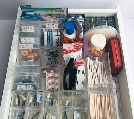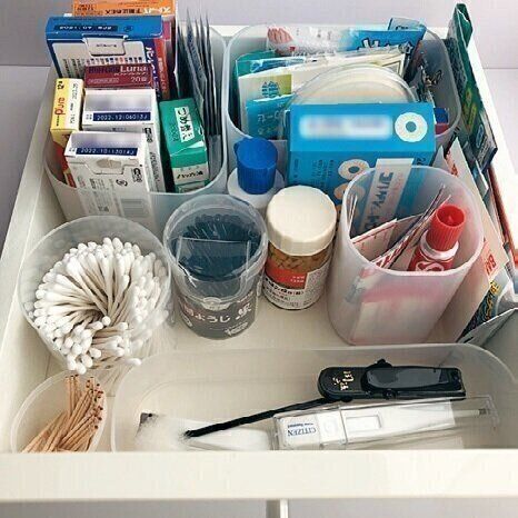 箱ごとだと場所を取るし、開けたらからっぽ……なんてことも。中身だけを仕切りつきケースや小袋にIN。薬の使用期限をラベリングし、毎日のむ薬は1回分ずつ小分けにしたらスッキリ~!