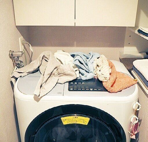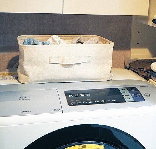 気力がない日は、たたまずにBOXにポイポイ入れて、使う場所の近くに置くだけ。そこにある物から優先的に使います。タオルや下着は洗濯機の上が定位置。布製BOXだから使わないときは折りたたみ可。