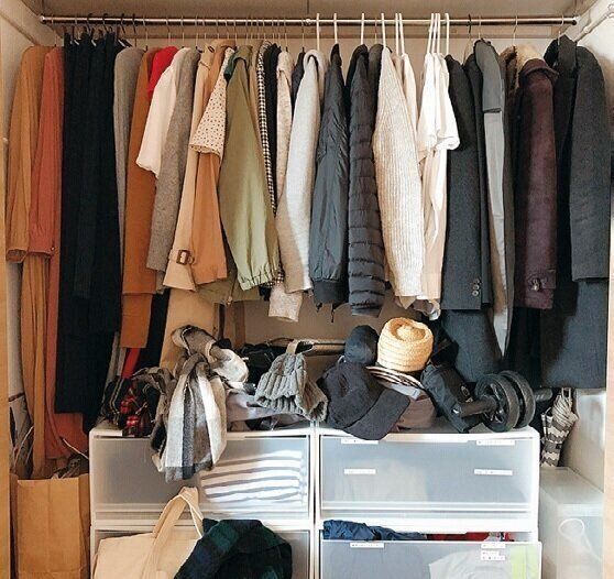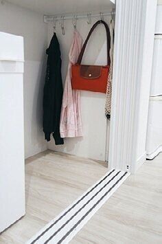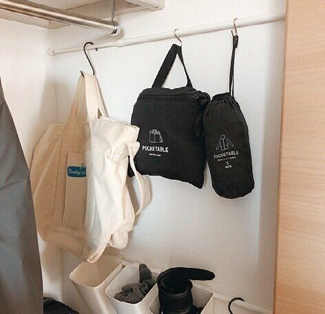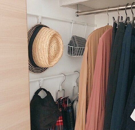 クローゼット内の両横の壁を収納に活用。壁に沿って突っ張り棒を渡し、S字フックなど引っ掛けられるグッスを使って小物を収納。どこに何があるか一目瞭然で探し物がなくなります。