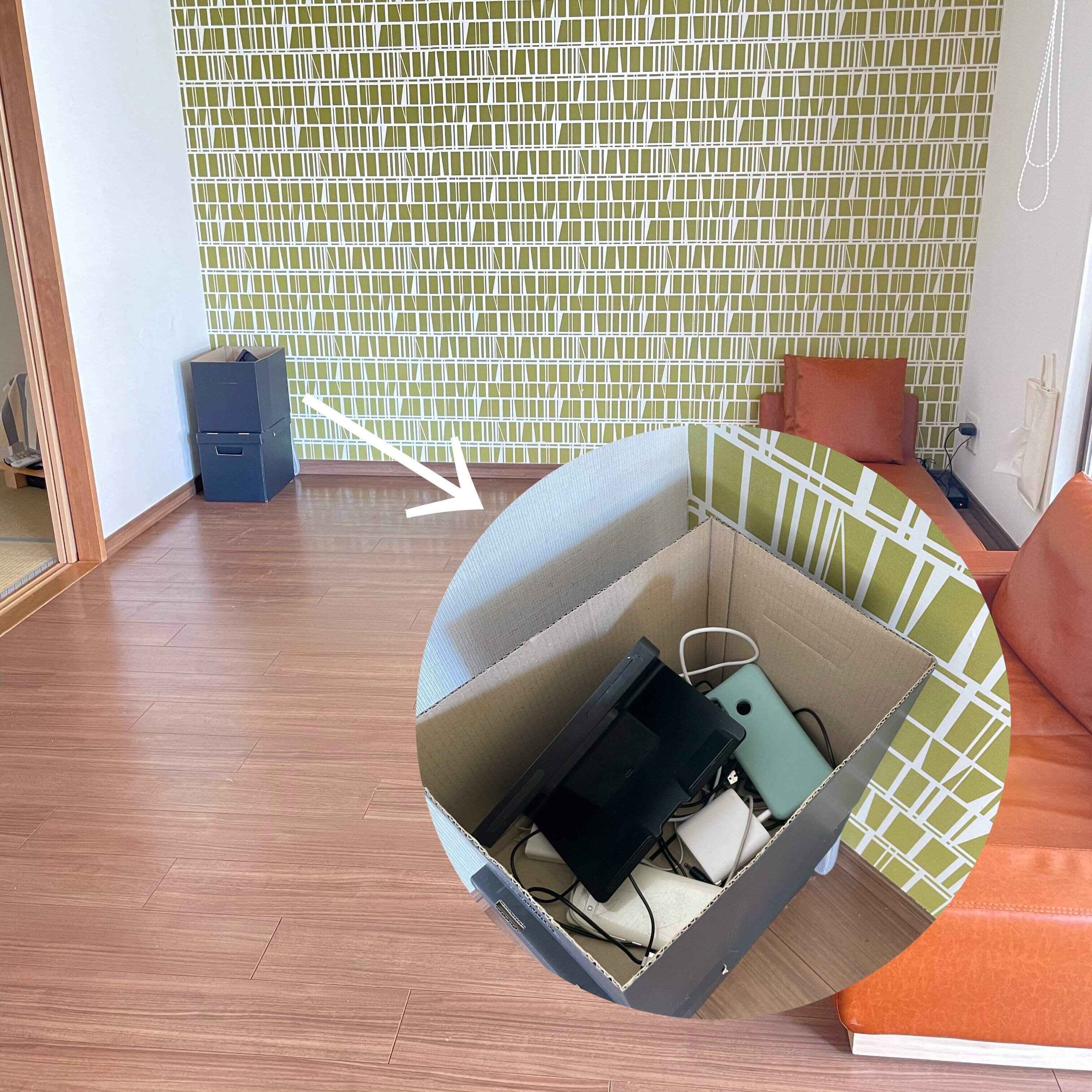 そこで、リビングの片隅にセリアで購入した段ボールボックスを設置してみました。