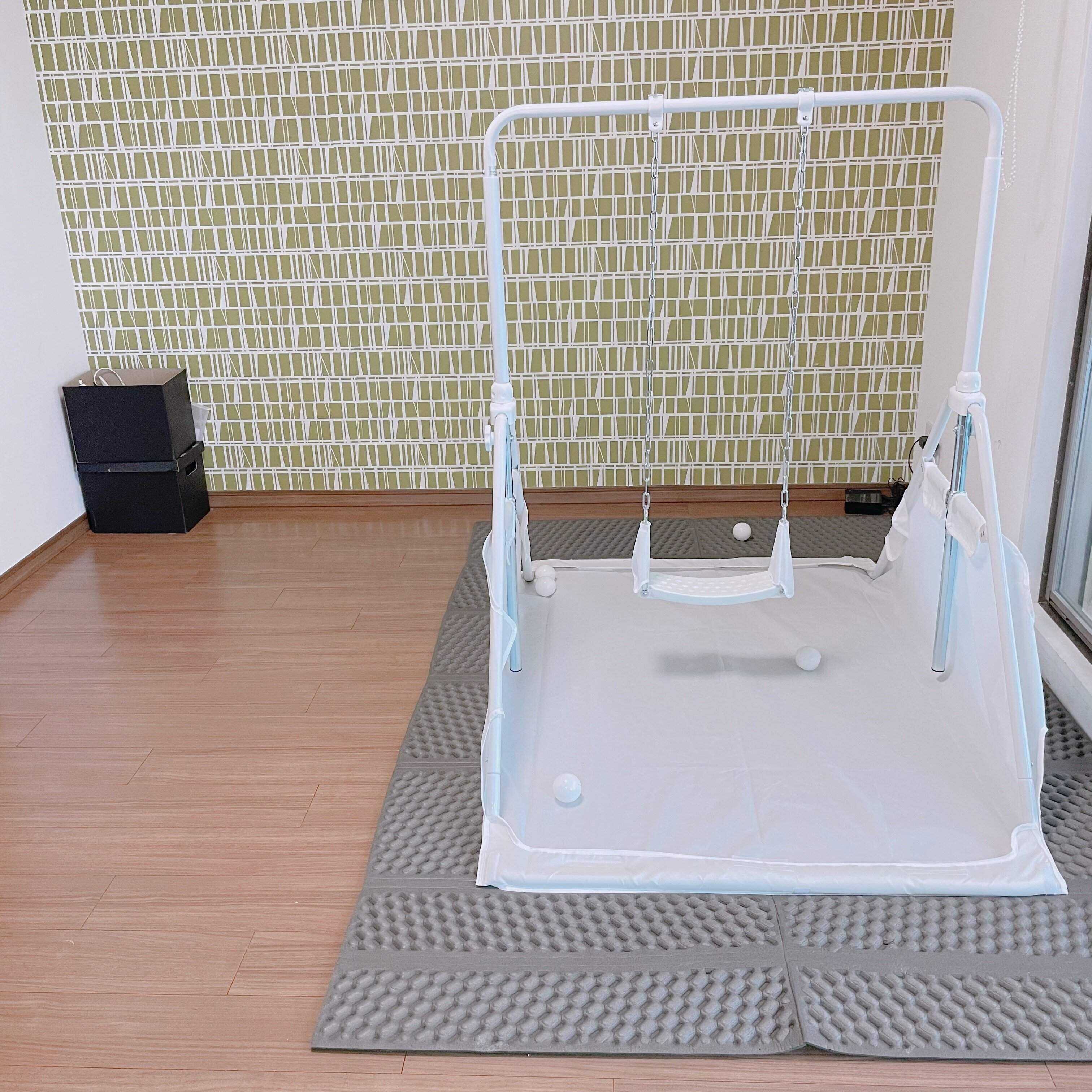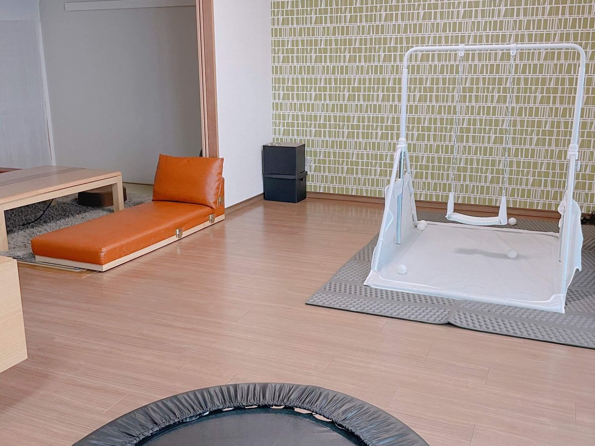 家具を移動させたことで、12帖ほどのリビングダイニングでも、ブランコとトランポリンを余裕をもって置けました。