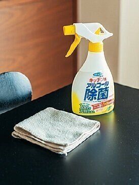 床、キッチン、鏡、家電とあらゆる拭き掃除に。定番はヘッドの噴射が優秀なアルコールスプレーと、ニトリのマイクロファイバーキッチンクロスです。