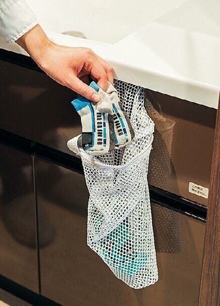 小さな靴下は、ネットに入れて洗えばバラバラになりません。子どもが入れられるように、ネットは洗面台へ引っ掛けておきます。