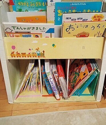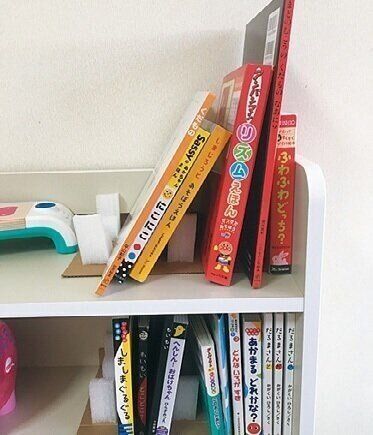 絵本の背表紙にマスキングテープを貼って色分けすれば、どの本をどの棚に戻すのかが一目瞭然。「同じ色のグループに戻すゲーム」にしちゃえば、子どもも遊びながら楽しく片づけられます。