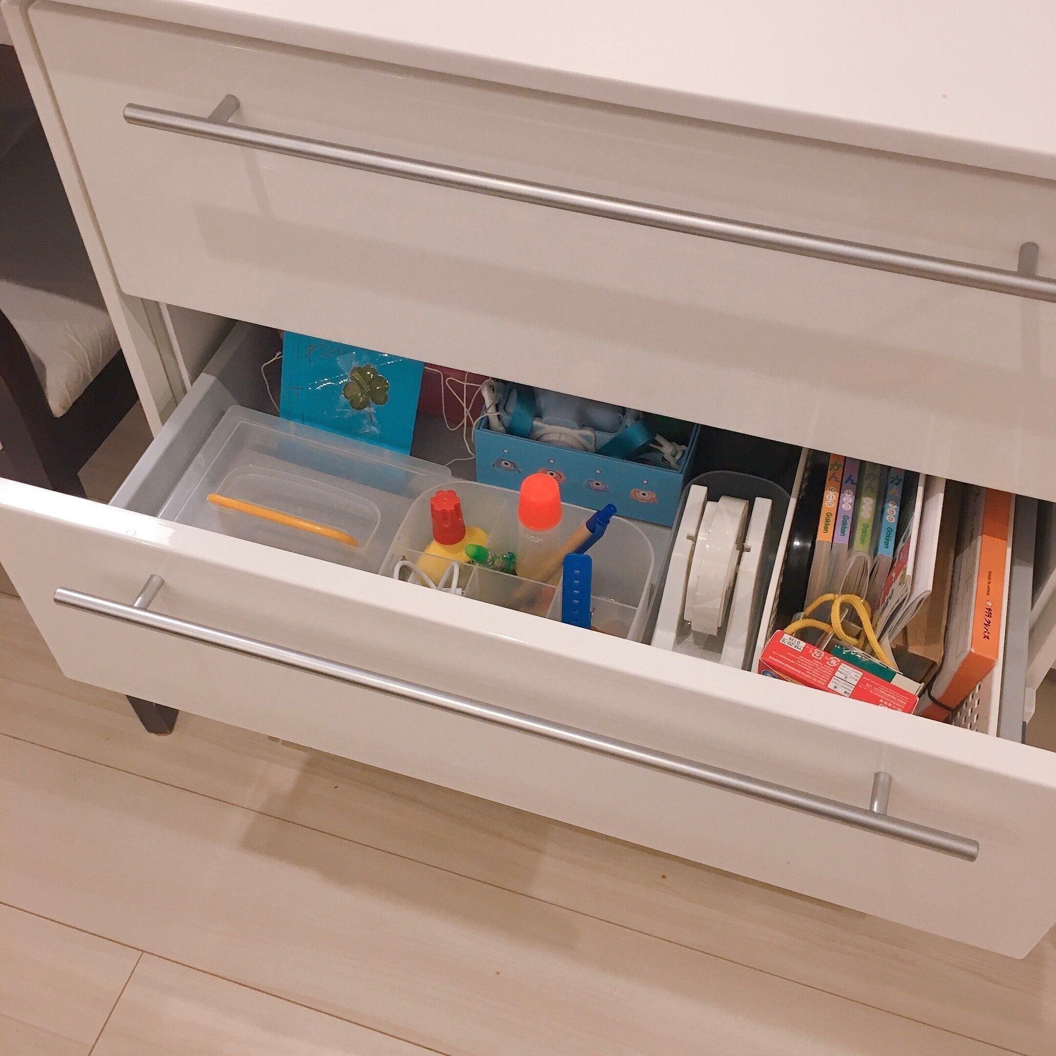 我が家では小5の娘、小1の息子用にリビングに引き出しを一つずつ用意して、自分のモノを収納するスペースを作っています。娘はお友達からもらったお手紙や自分の財布やお気に入りのノート、デジカメなどを入れています。息子はリビングで工作をする時に使うハサミや折り紙のセットやよく読む本などを収納しています。