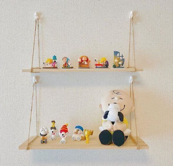 100均の板と紐、画鋲を使ってブランコ風の収納棚をDIY。ぬいぐるみを置けば素敵な収納棚になりますね。まるでブランコに乗って遊んでいるみたい!