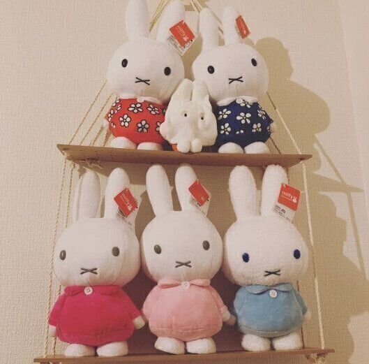 かわいいミッフィーのぬいぐるみも飾り棚を設置して見える収納。ブランコに乗っているようでかわいい収納ですね。
