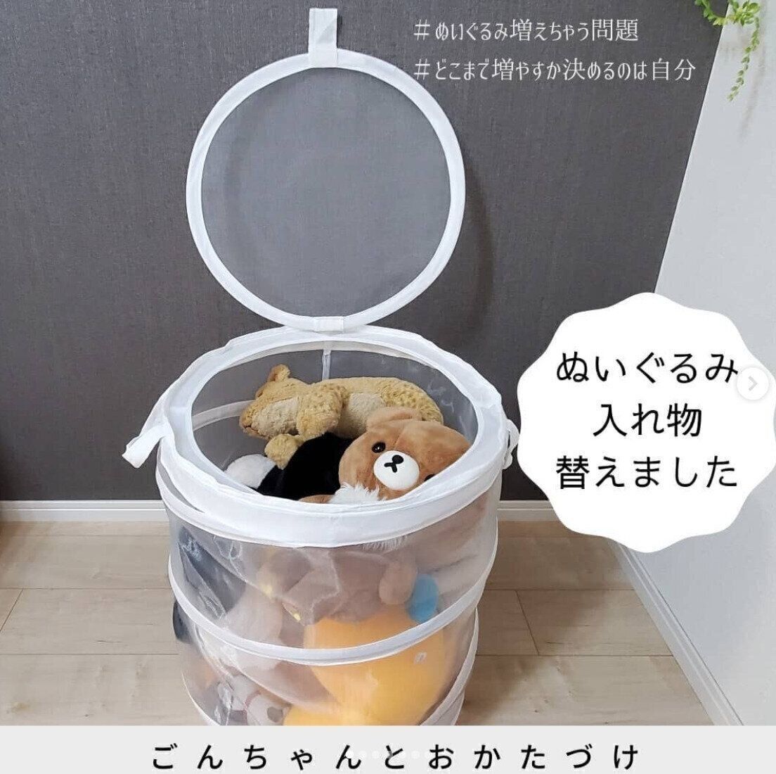 IKEAのFYLLEN フィレン ランドリーバスケットは、ぬいぐるみ収納にも◎。メッシュタイプなので中が見えるのもポイントで、使わないときはたたんで収納可能ですよ。生活に取り入れたくなる素敵なアイデアです。