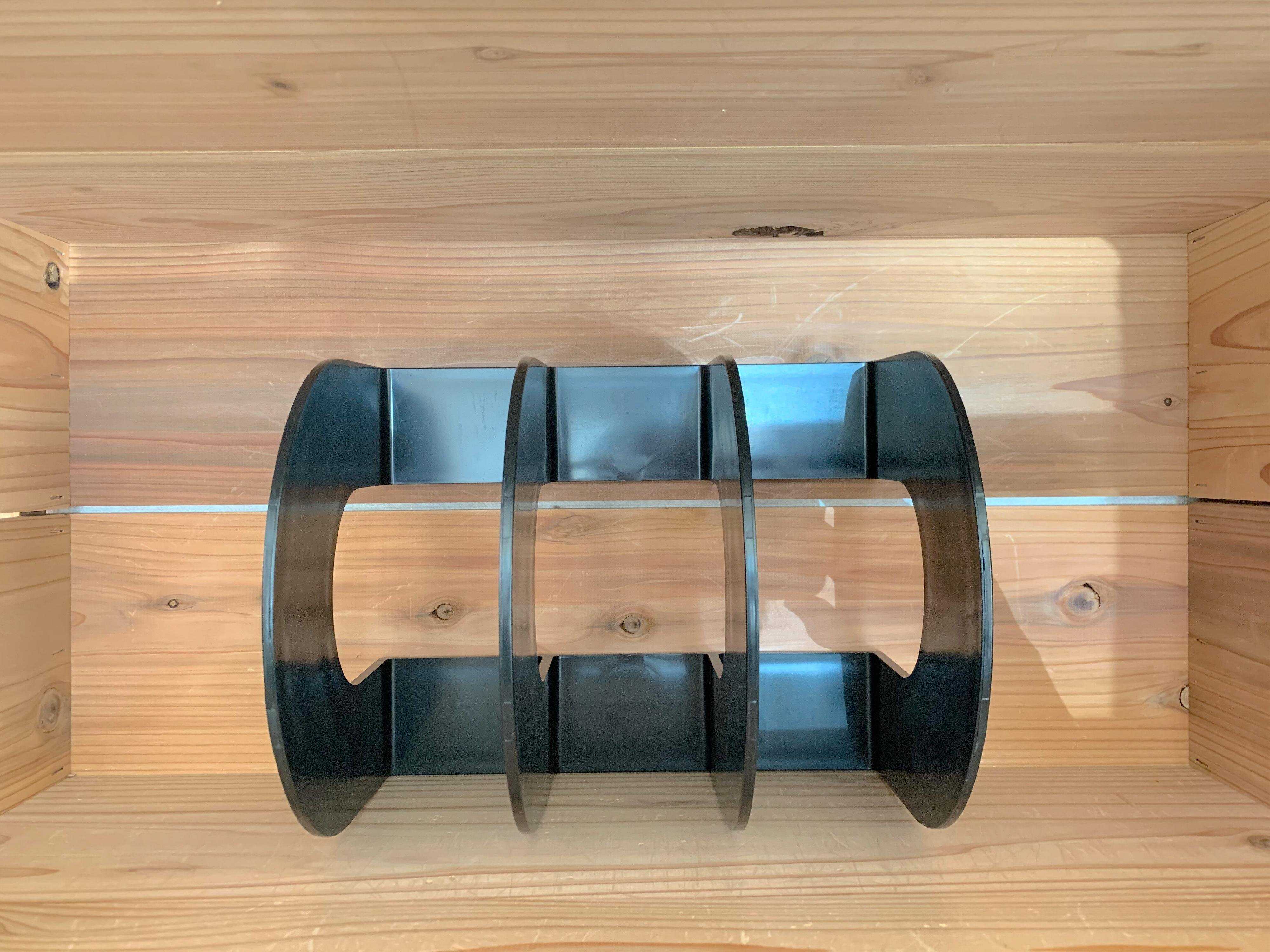本棚の背面にブックエンドを貼り付けています。ブックエンドのおかげで、絵本が倒れにくくなり、子どもでも簡単に絵本を戻せるようになりました。