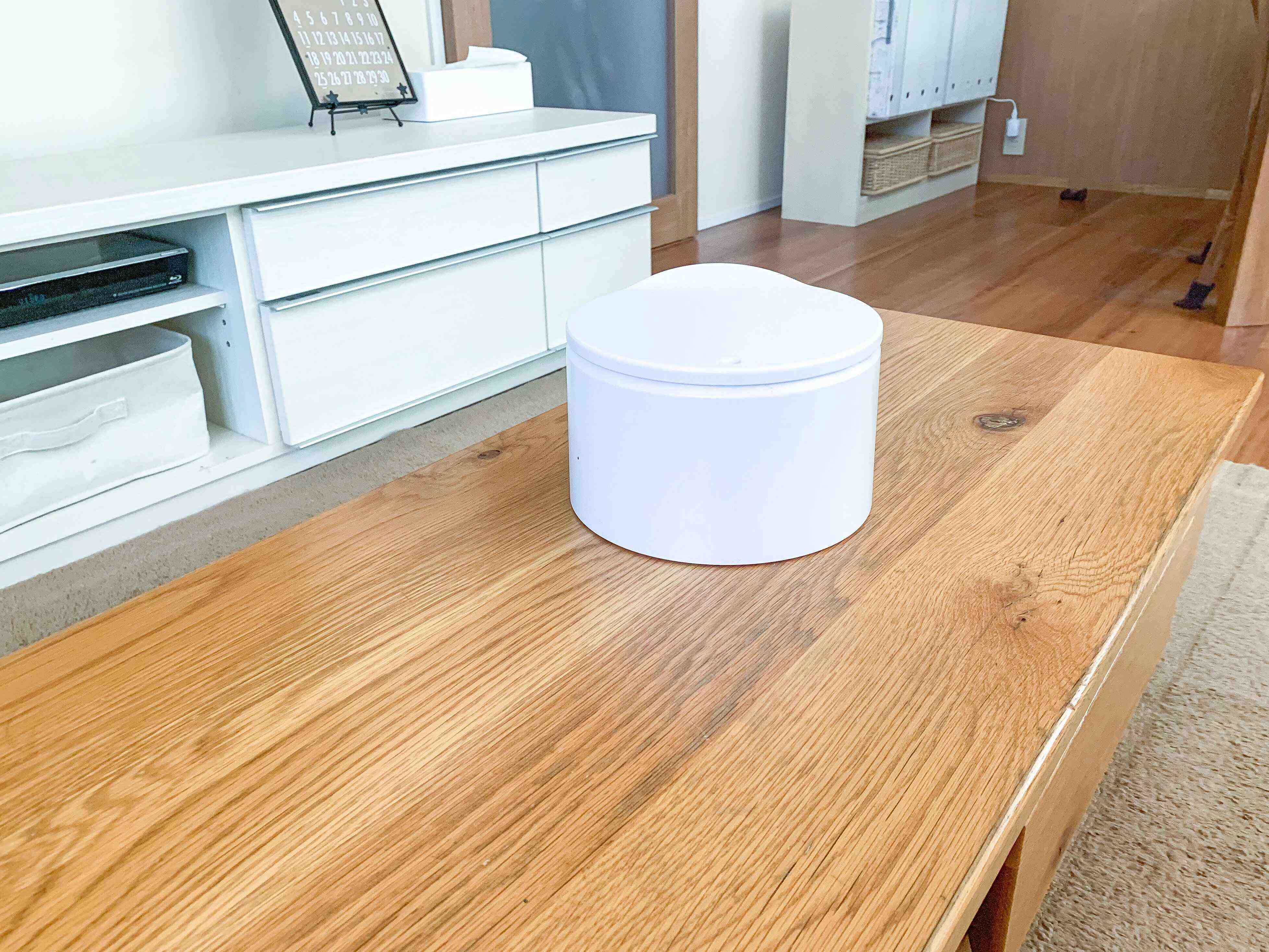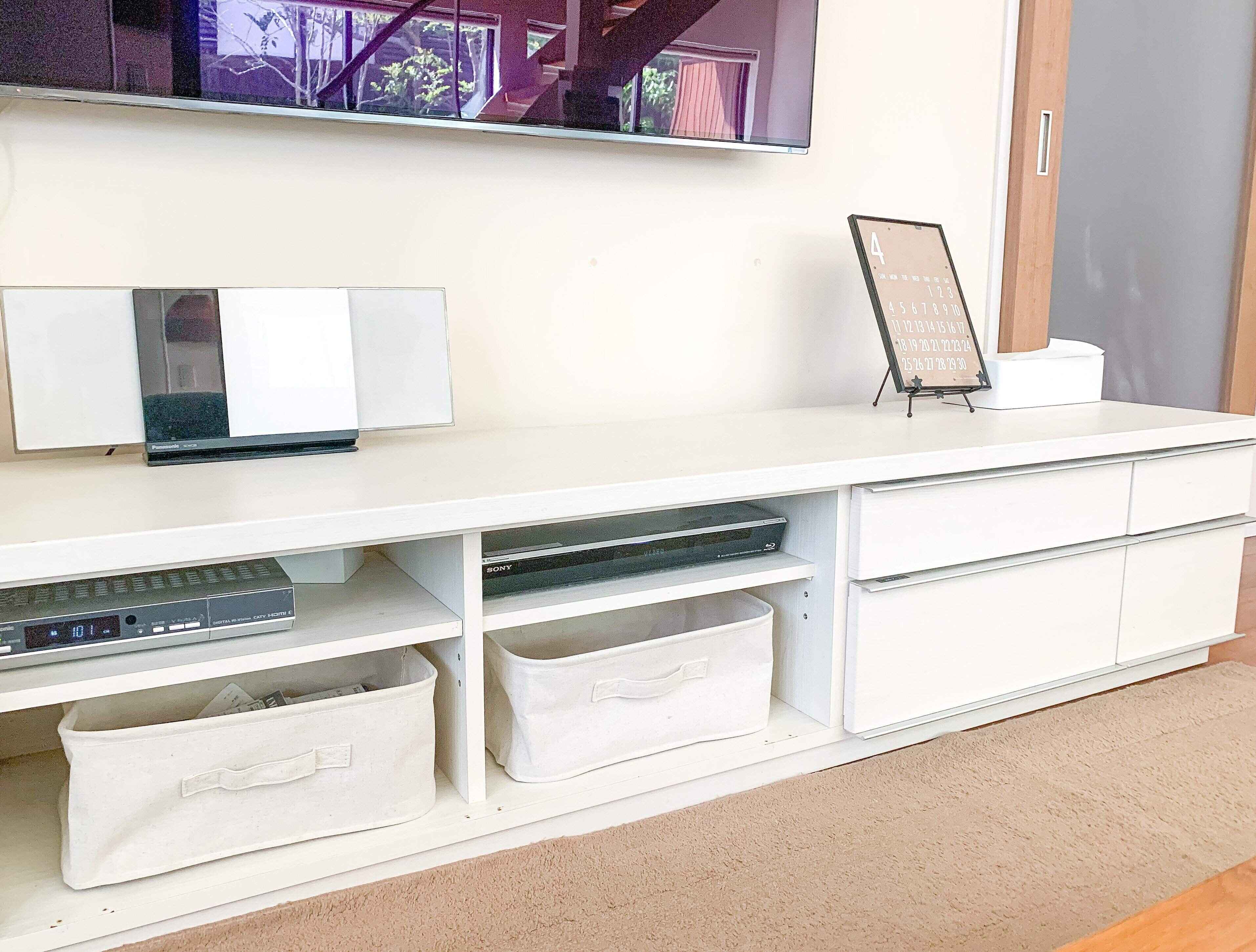 そこで、「無印良品」のソフトボックスにとりあえず入れて、テレビ台に置いておくようにしました。